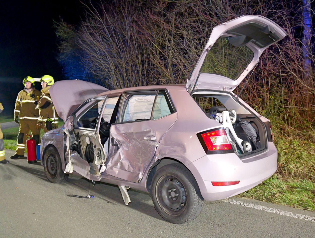 Paderborn-Neuenbeken. Gegen 17.40 Uhr geriet eine 19-jährige Skoda-Fahrerin mit ihrem Fabia in Fahrtrichtung Schlangen in einer Rechtskurve aus ungeklärter Ursache nach links auf die Gegenfahrbahn und kollidierte dort mit einem entgegenkommenden Mercedes C180 eines 55 Jahre alten Mannes. Ein Ford Mondeo eines 34-Jährigen wird durch Trümmerteile beschädigt.