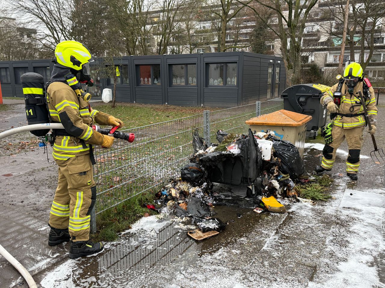 Um 14.39 Uhr am Silvestertag wurde die Feuerwehr Paderborn nach Notrufen zu einem Kleinbrand im Freien zum Bayernweg an der Bonifatius-Grundschule alarmiert. Zwei Minuten später wurde das Alarmstichwort auf „Containerbrand mit Ausdehnung“ erhöht, berichtet Einsatzleiter Markus Norbel. In der Nähe einer Überdachung brannte dort ein 1,1 Kubikmeter fassender Kunststoff-Müllgroßbehälter.