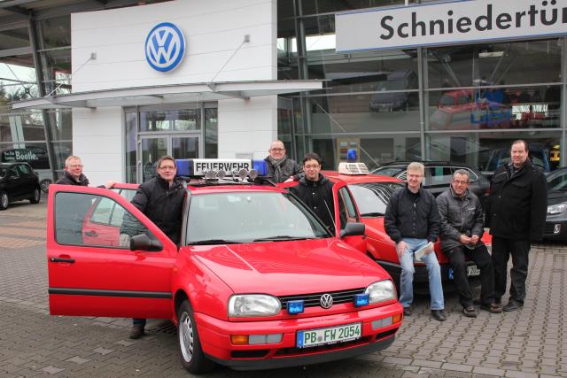 Delbrück (br). Um die Tagesalarmbereitschaft weiter zu verbessern, hat der Feuerwehr-Stadtverband Delbrück zwei gebrauchte, rote VW-Kombi angeschafft und herrichten lassen. Die Autos sollen ausgerüstet mit Sondersignal und Funk beim Möbelhersteller Gepade und im Gewerbegebiet Ost stationiert werden. Manfred Schniedertüns vom gleichnamigen Autohaus überreichte dem Delbrücker Löschzugführer Peter Schniedertüns und Wehrführer Reinhard Brand (r.) die Fahrzeugpapiere. „Nach Absprache kann eine direkte Anfahrt zur Einsatzstelle erfolgen. Wir haben mit dem älteren Löschgruppenfahrzeug bei Gepade, das nun ersetzt wurde, und einem weiteren Bereitschaftsauto bei der Maschinenbaufirma Hartmann gute Erfahrungen gemacht“, erläuterte Brand. Während der Arbeitszeit können die Gepade-Mitarbeiter Hans Thiele, Leo Güniker, Ralf Fischer (l.) und Martin Neuschäfer direkt ausrücken. Eine Gruppe unter der Leitung von Mike Gausemeier (Mitte) und Ralf Fischer hatte dieses neue System für Einsatz- und Zubringdienste erarbeitet. „Wenn es sich bewährt, nehmen wir die vom Stadtverband betriebenen Fahrzeuge in den Brandschutzbedarfsplan auf und übergeben sie der Stadt“, kündigte Brand an.