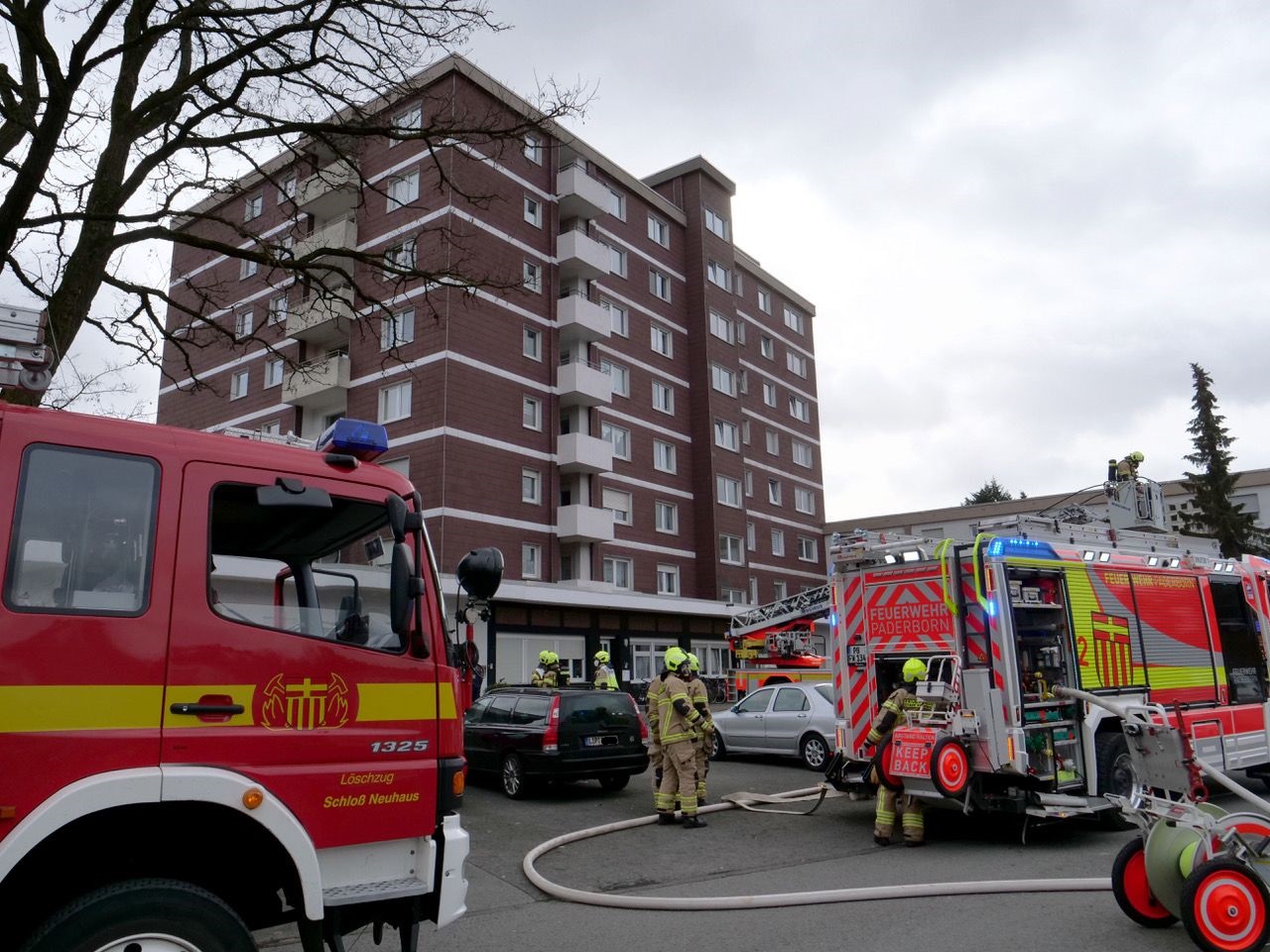 Feuerwehreinsatz am Sonntagnachmittag in der Ernst-Reuter-Straße im Stadtteil Schloss Neuhaus. Gegen 14.30 Uhr nahm ein Bewohner des Hochhauses Brandgeruch wahr und wählte den Notruf. Um 14.33 Uhr wurde die Paderborner Feuerwehr unter dem Stichwort „Zimmerbrand, Menschenleben in Gefahr“ alarmiert.