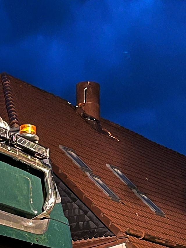 Der Blitz war in einen Abluftkamin auf dem Dach der Stallungen eingeschlagen. Dadurch kam es zu einer Brandentwicklung im Firstbereich des Daches. Durch das beherzte Eingreifen der Eigentümer, die unverzüglich eigene Löschversuche unternahmen, gelang es, die Brandausbreitung bis zum Eintreffen der Feuerwehr zu begrenzen. Die Feuerwehr führte noch Nachlöscharbeiten über die Drehleiter durch. Dabei kam ein Trupp unter Atemschutz zum Einsatz, berichtet Einsatzleiter Andreas Luig, zugleich stellvertretender Wehrführer. Anschließend wurde die Brandstelle ausgiebig mit der Wärmebildkamera kontrolliert.