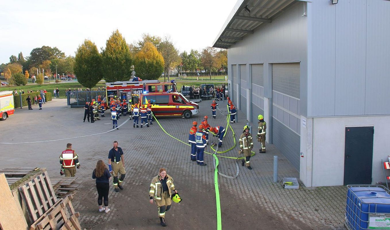 Delbrück. Eine Rauchwolke steht über einer Lagerhalle am Zaunkönigweg in Delbrück. Schon nach kurzer Zeit nähert sich ein Feuerwehrfahrzeug mit Blaulicht und Martinshorn. Glücklicherweise handelt es sich nicht um einen Realeinsatz, sondern ein groß angelegtes Übungsszenario für 74 Mitglieder der Delbrücker Jugendfeuerwehr im Rahmen des Berufsjugendfeuerwehrtages.