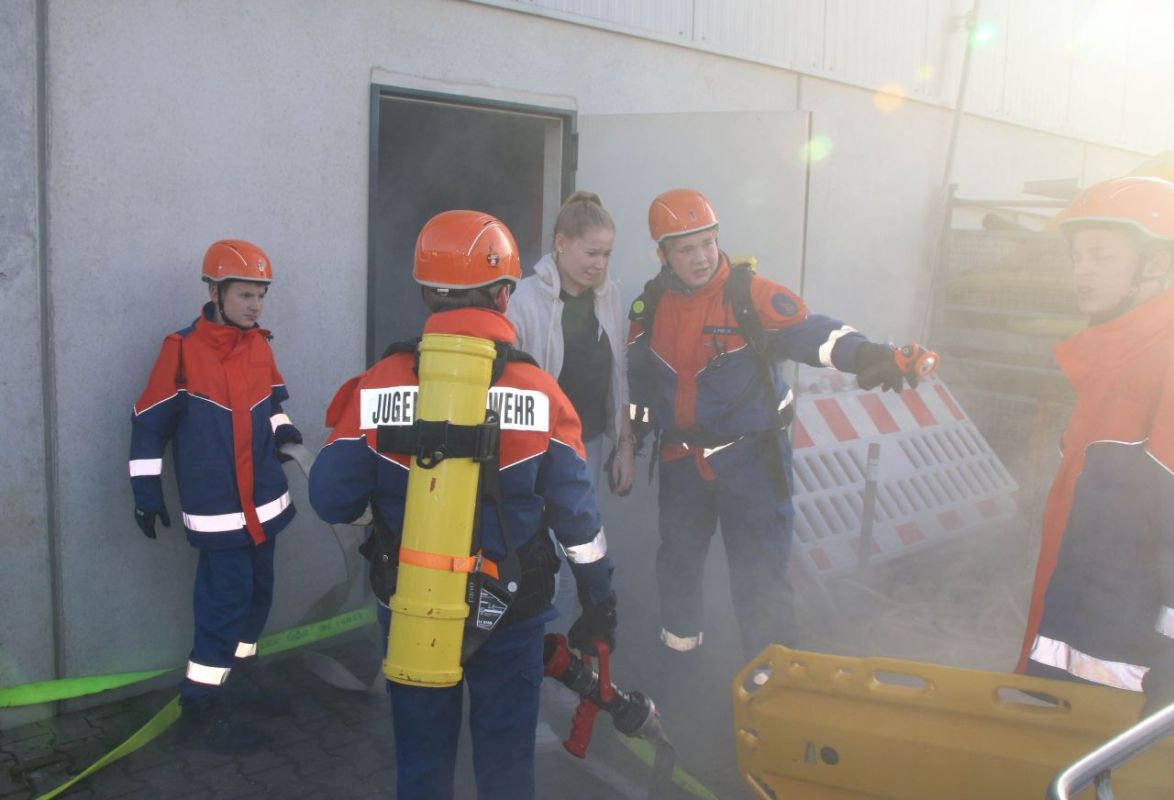 Während sich eine Gruppe mit simuliertem Atemschutz ausrüstete, um zur Menschenrettung in die Halle vorzudringen, bereiteten weitere Jugendliche einen Löschangriff vor und bauten auch eine Wasserversorgung auf. Eine Sammelstelle für die vermissten Personen wurde ebenfalls vorbereitet. Hier sollten die Personen betreut und gegebenenfalls medizinisch versorgt werden. Nach und nach wurden die Personen gefunden, einige konnten aus dem Gebäude herausgeführt werden, andere mussten getragen werden.