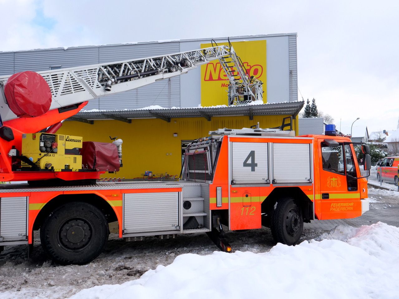 Gegen 12 Uhr erreichte die Leitstelle der Feuerwehr ein Notruf aus einem Lebensmittel-Discount-Markt in einer Ladenzeile an der Bielefelder Straße im Stadtteil Schloss Neuhaus. Dort biege sich, so die telefonische Nachricht, das Vordach unter den Schneemassen durch.