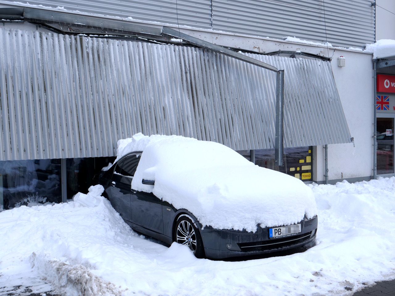 Ein BMW, der offensichtlich bereits seit einigen Tagen vor dem Geschäft gestanden hatte, wurde von der Dachlawine getroffen. Ob das Fahrzeug auch von der Wellblecheindeckung selbst getroffen wurde, steht noch nicht fest. Die Feuerwehr, die mit insgesamt rund 20 Feuerwehrleuten im Einsatz war, ließ sofort den Zugangsbereich des Lebensmittel-Marktes sperren. Parallel dazu begannen die Einsatzkräfte damit, den Schnee auf dem Vordach vom Korb der Drehleiter aus nach unten zu schaufeln.