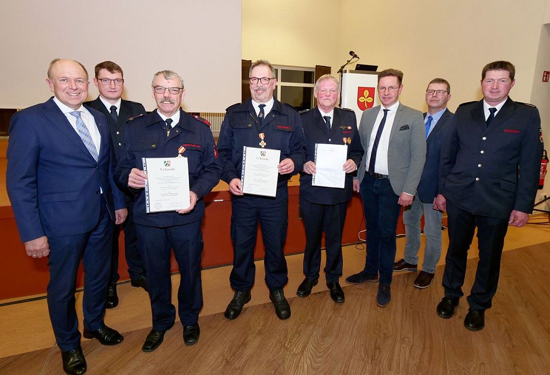 Das Feuerwehr-Ehrenzeichen in Gold für 35-jährige aktive Mitgliedschaft erhielten Ralf Daldrup, Tobias Rupprecht, Andreas Niggemeyer, Ingo Arlt-Gees, Franz-Josef Nillies, Mark Schütte, Martin Westermeir, Roger Wiesner, Matthias Petsche, Dirk Kuhlmann, Thomas Thiele, Oliver Voß, Arnold Schulte, Andreas Berg, Helmut Becker, Herbert Figgemeier, Jürgen Werner, Ludger Hecker und Matthias Kukuk.