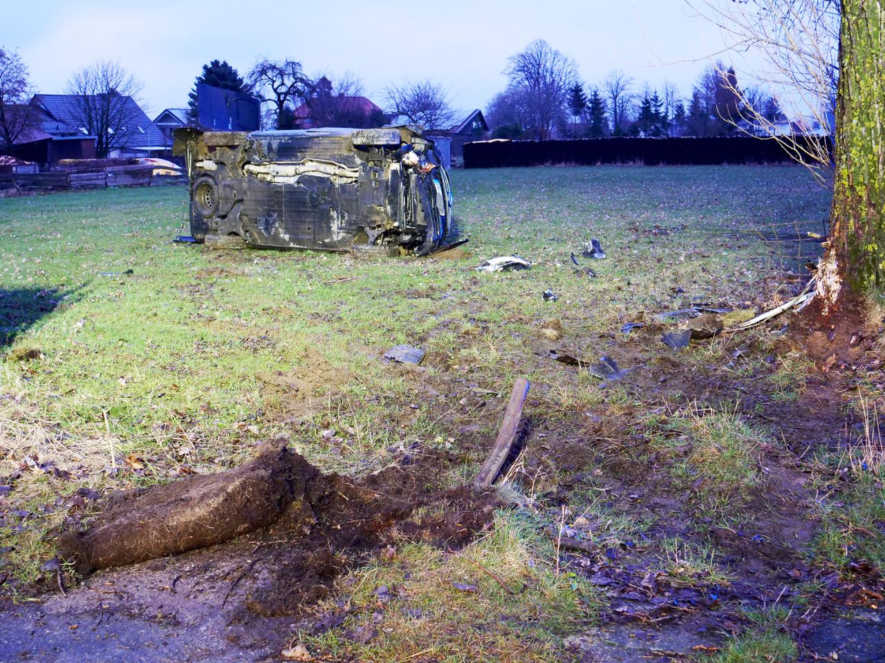 Dann pflügte der Transporter quer durch eine Wiese in Richtung der Straße Grüner Weg. Diese überquerte der Wagen, prallte mit erheblichem Tempo gegen ein stählernes Weidetor, das aus der Verankerung gerissen wurde und streifte einen massiven Baum. Dadurch wurde der Wagen herumgeschleudert und kippte auf die Fahrerseite, wo er schwer beschädigt liegenblieb. Nach einem automatischen e-call-Notruf alarmierte die Mercedes-Leitstelle die Leitstelle im Kreis Paderborn, die 6.25 Uhr die Feuerwehr Bad Wünnenberg unter dem Stichwort „Verkehrsunfall, eingeklemmte Person“ die Feuerwehr Bad Wünnenberg.