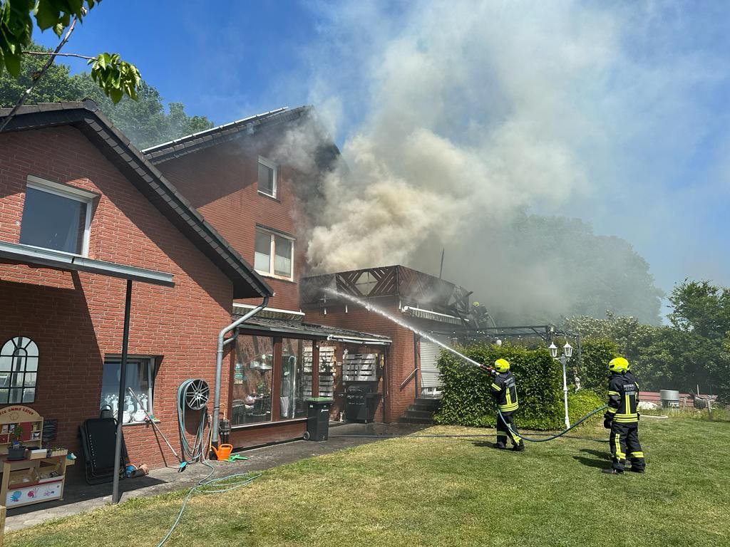 Hövelhof. Bei Eintreffen des Wehrführers Sebastian Lienen, stand die rückseitige Holzterrasse bereits in Vollbrand und hatte auf den Dachstuhl übergegriffen. Durch die enorme Wärmestrahlung zerbarst die Terrassentür wodurch das Feuer in die Wohnung des Obergeschosses ausbreiten konnte. Alle Bewohner konnten sich aber unverletzt ins Freie retten.