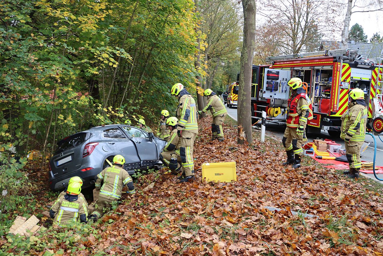 72-jährige Autofahrerin bei Alleinunfall in Delbrück schwer verletzt. Technische Rettung aus E-Auto erweist sich als sehr aufwendig,