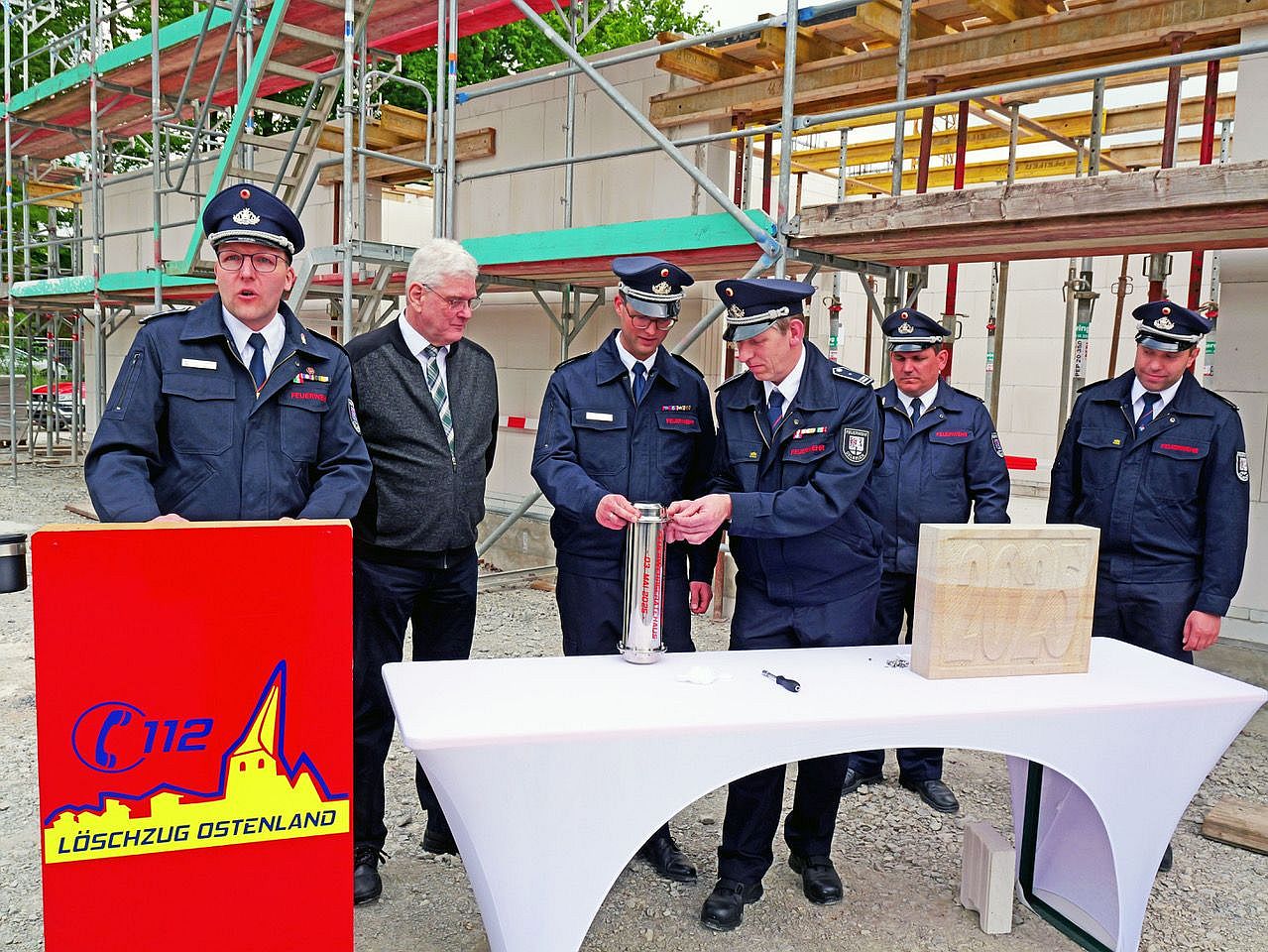 Nicht einmal vier Monate nach dem ersten Spatenstich wurde am Samstag der Grundstein für den Neubau des Feuerwehrgerätehauses in Ostenland gelegt. Zuvor befüllten Löschzugführer Peter Bathe und seine Stellvertreter Steffen Knapp und Markus Fortmeier eine Zeitkapsel mit einem Mannschaftsfoto, einer Mitgliederliste, aktuellen Tageszeitungen, Bauplänen und einem Meldeempfänger.