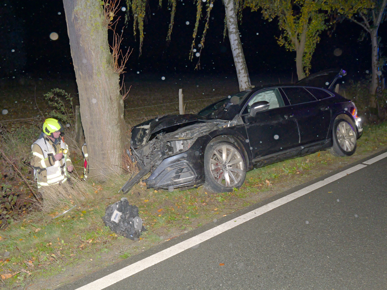 Bei einem Verkehrsunfall auf der Elser Hude (K28) ist in der Nacht zu Montag ein VW Arteon gegen einen Straßenbaum geprallt.