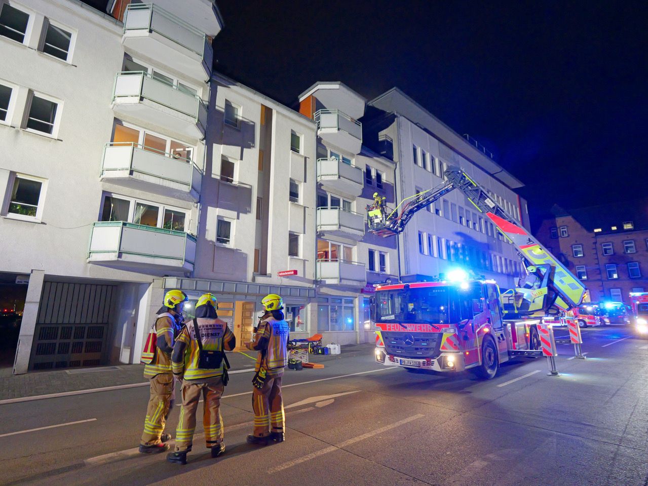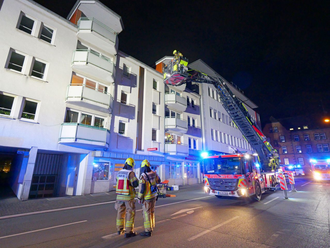 Mit Überdrucklüftern hielt die Feuerwehr das Treppenhaus rauchfrei, und Trupps unter Atemschutz führten die beiden Frauen ins Freie, wo sie dem Rettungsdienst übergeben und gesichtet wurden. Eine weitere Behandlung war nicht erforderlich. Vor dem Haus ging zusätzlich eine Drehleiter in Stellung. Parallel dazu wurde die Wohnung belüftet. Im Erdgeschoss des Wohngebäudes ist die Verbraucherberatung untergebracht.