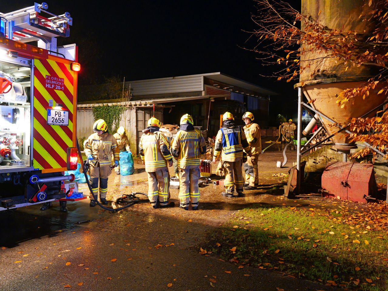 Die Kräfte des Löschzugs Westenholz waren gerade auf der Rückfahrt von einer Brandmeldeanlage in einem Seniorenheim im Delbrücker Stadtteil Schöning, wo vergessenes Essen auf einem Herd die Brandmeldeanlage ausgelöst hatte. Als die Fahrzeuge über die der Grubebachstraße rollten, lösten die Melder aus. Gleichzeitig sahen die Feuerwehrleute die Rauchwolke über dem Betriebsgelände. Sofort fuhren sie zur Einsatzstelle und leiteten einen Löschangriff ein.