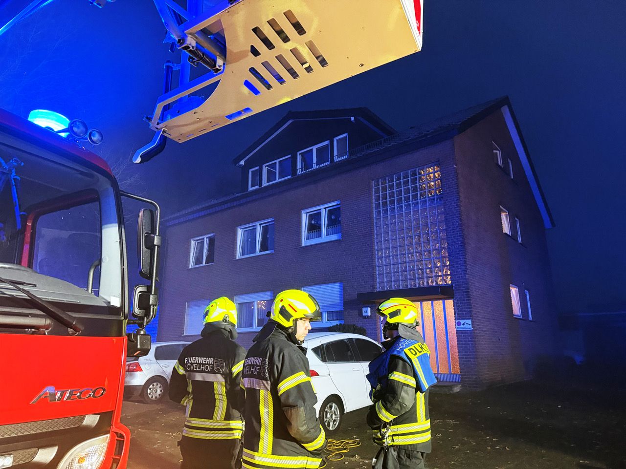 Bei einem Brand in einem Mehrparteienhaus an der Detmolder Straße im Hövelhofer Ortsteil Riege musste die Feuerwehr am Freitagmorgen vier Personen über die Drehleiter und Steckleitern retten. Sie kamen bei dem Feuer nicht zu Schaden. Auslöser war ein Brand in einem Stromverteilerkasten im Treppenhaus, der zu einer kompletten Verrauchung des Fluchtweges für die oberen Etagen führte. Insgesamt hielten sich fünf Bewohner in dem Haus auf.