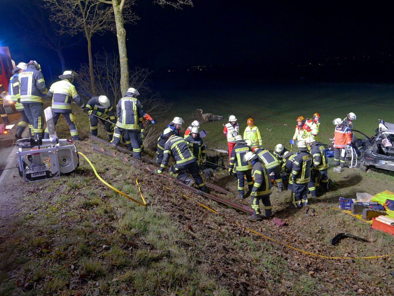 Beide Insassen waren massiv eingeklemmt und wurden von rund 35 Feuerwehrleuten mit hydraulischen Geräten aus dem Wrack befreit. Wegen der Schwere der Verletzungen und der eingesetzten Kräfte wurde auch der Leitende Notarzt Axel Fädrich aus Paderborn sowie die beiden nachtflugtauglichen Rettungshubschrauber Christoph Dortmund und Christoph Westfalen (Greven) zur Unfallstelle beordert und landeten in der Nähe der Unfallstelle. Wegen des Höhenunterschiedes zwischen Straße und Grünland brachten Feuerwehrleute Leiterteile an der Böschung an.