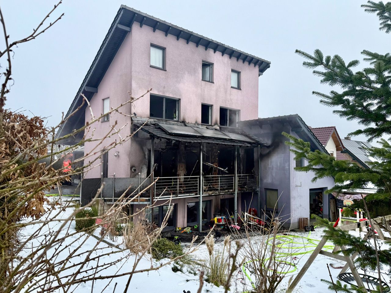 Beim Eintreffen der Feuerwehr stand die gesamte Rückfront des Gebäudes bereits im Vollbrand. Vermutlich war der Brand auf einem rückwärtig umlaufenden Balkon im ersten Obergeschoss ausgebrochen. Rasch schlugen die Flammen an der Gebäuderückseite bis in den Dachstuhl hoch. Auch ein Wohnzimmer brannte aus. Nach Einschätzung Kaisers stand das stark verrauchte Gebäude bereits kurz vor einer explosiven Durchzündung. Angebranntes Kinderspielzeug lag auf dem Erdboden, und der Balkon ist einsturzgefährdet. Im zweiten Obergeschoss auf er Rückseite platzten die Scheiben der Fenster.