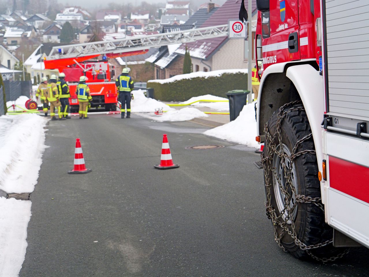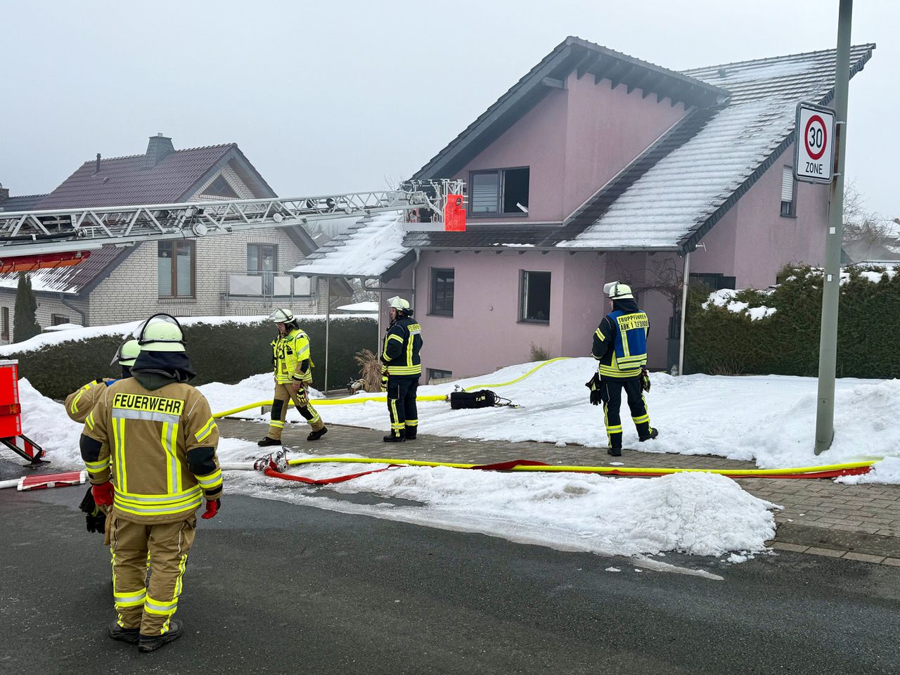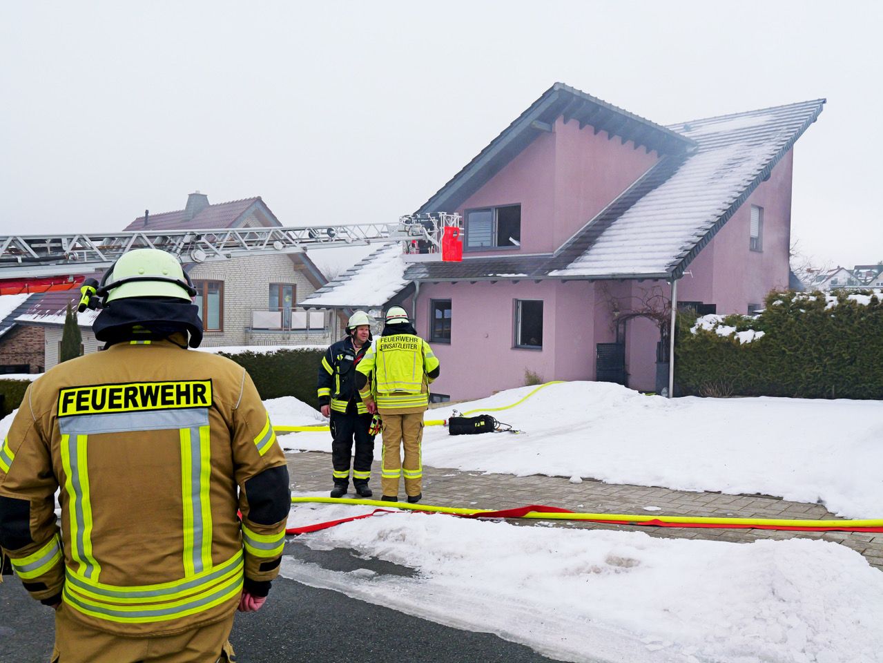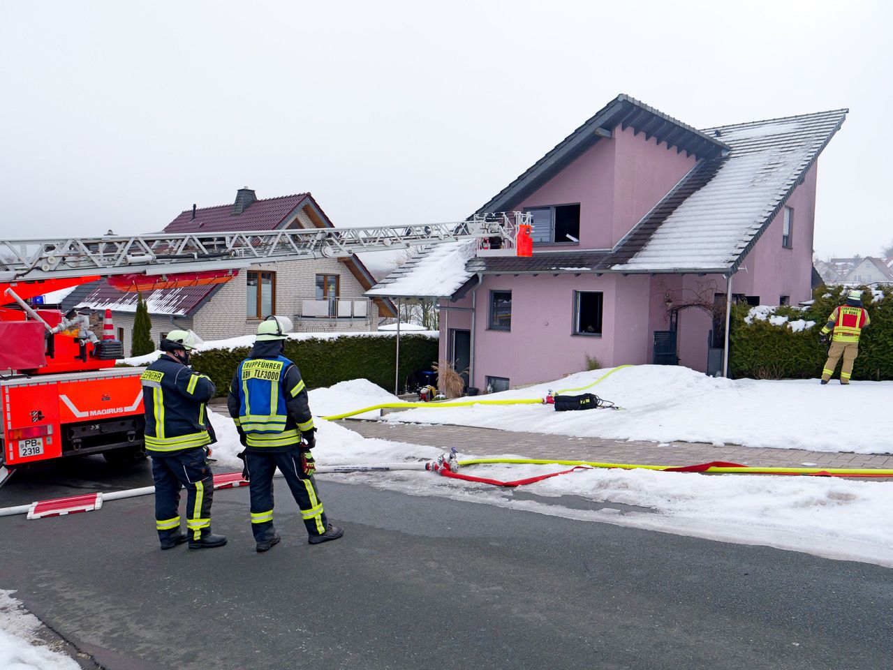 Bereits auf der Anfahrt wies eine schwarze Rauchwolke der Feuerwehr den Weg in Richtung Sportplatz und Winterbergstraße. Daraufhin ließ Einsatzleiter Sebastian Kaiser, stellvertretender Leiter der Feuerwehr Altenbeken, das Einsatztischwort auf „Dachstuhlbrand“ erhöhen, worauf sämtliche Löschzüge der Gemeinde alarmiert wurden. Aufgrund der Witterungsverhältnisse waren die Löschfahrzeuge und die Drehleiter in der Eggegemeinde noch mit Schneeketten ausgerüstet.