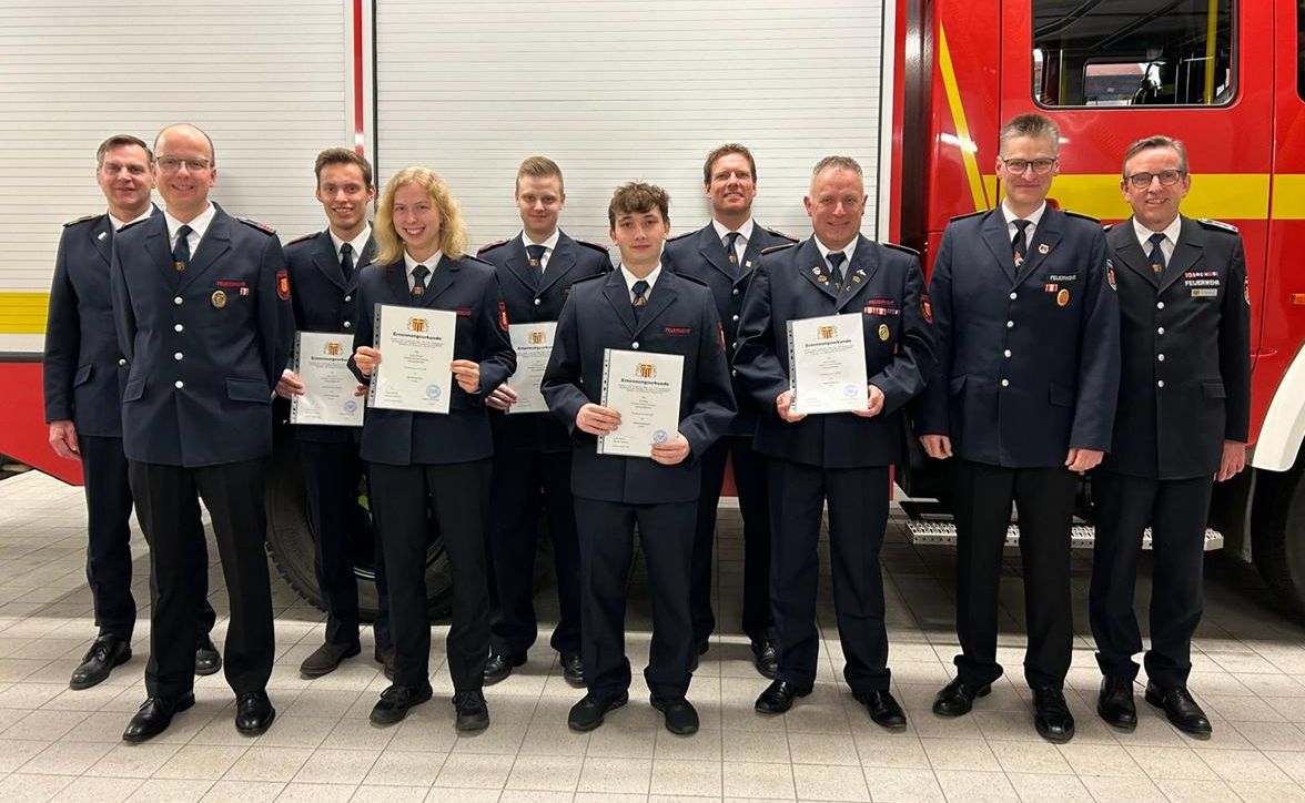 Im Rahmen der Versammlung wurden folgende Beförderungen ausgesprochen: Theresa Mertens wurde zur Oberfeuerwehrfrau, Maurice Prior und Erik Maciej zu Oberfeuerwehrmännern befördert. Jan Paul Püschel erhielt die Ernennungsurkunde zum Oberbrandmeister, und Markus Schröder trägtdie Schulterstücke des Hauptbrandmeisters.
