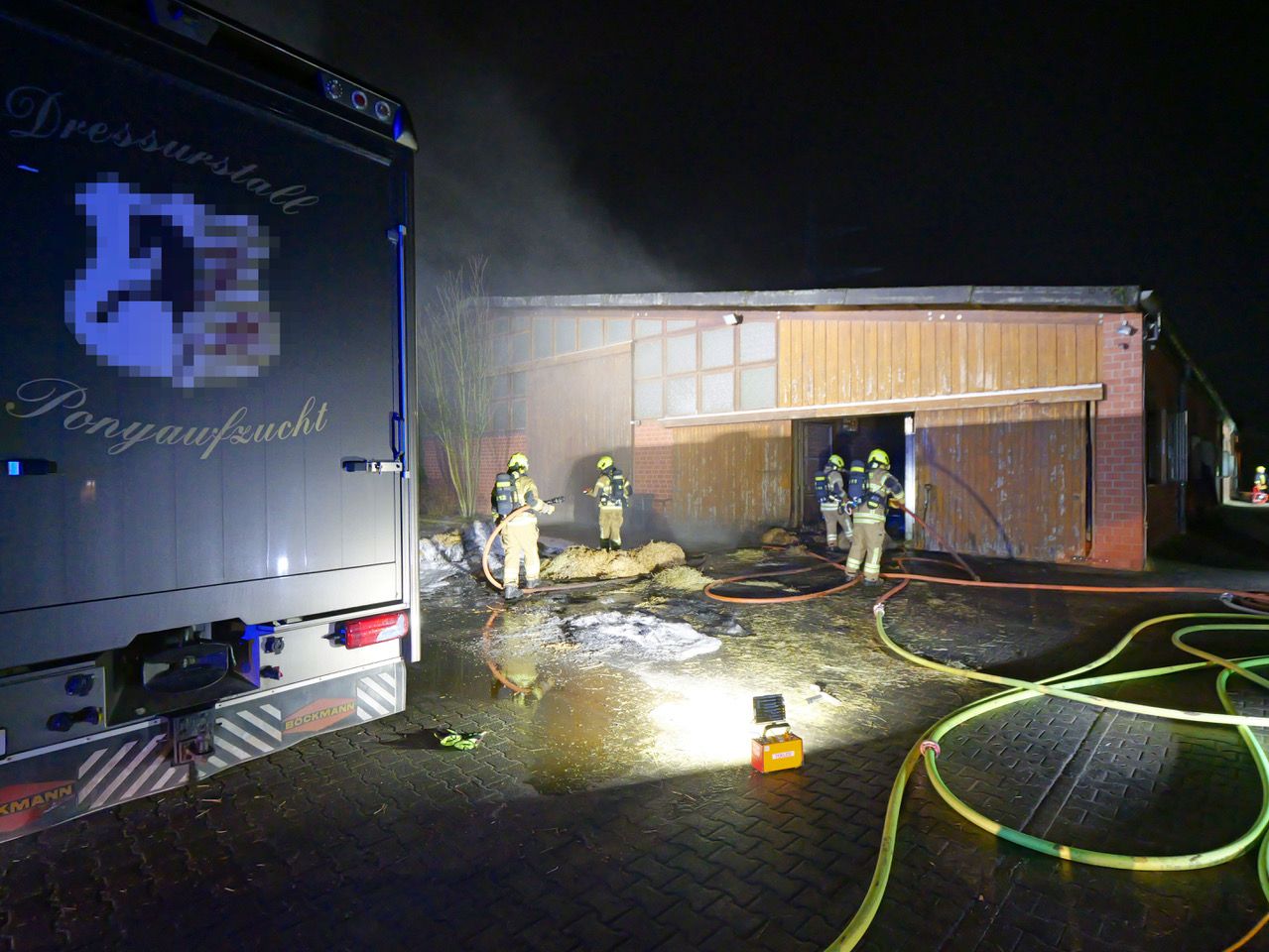 Weitere fünf Tiere aus der Ponyaufzucht wurden durch die Feuerwehr ins Freie gebracht. Mit dem mehreren Hochleistungslüftern wurde parallel der Rauch aus den Stallgassen ins Freie geblasen. Allein die Entrauchung des angrenzenden Reithalle und die Nachlöscharbeiten dauerten rund zwei Stunden.Während des Löscheinsatzes, der sich über mehrere Stunden hinzog, trafen weitere Beschäftigte des Betriebes ein, die die Betreuung der Pferde übernahmen. Die Bewohner des Bauernhofes, die bei der Tierrettung Rauchgase eingeatmet hatten, wurden nach notärztlicher Sichtung mit zwei Rettungswagen zur weiteren Behandlung ins Krankenhaus eingeliefert. Später eintreffende Verwandte kümmerten sich um die Kinder der Betreiber.