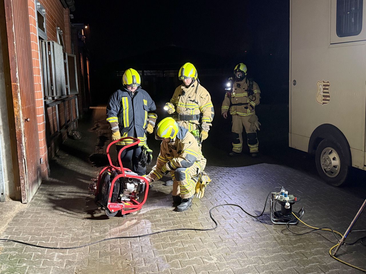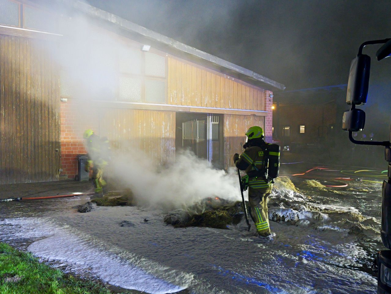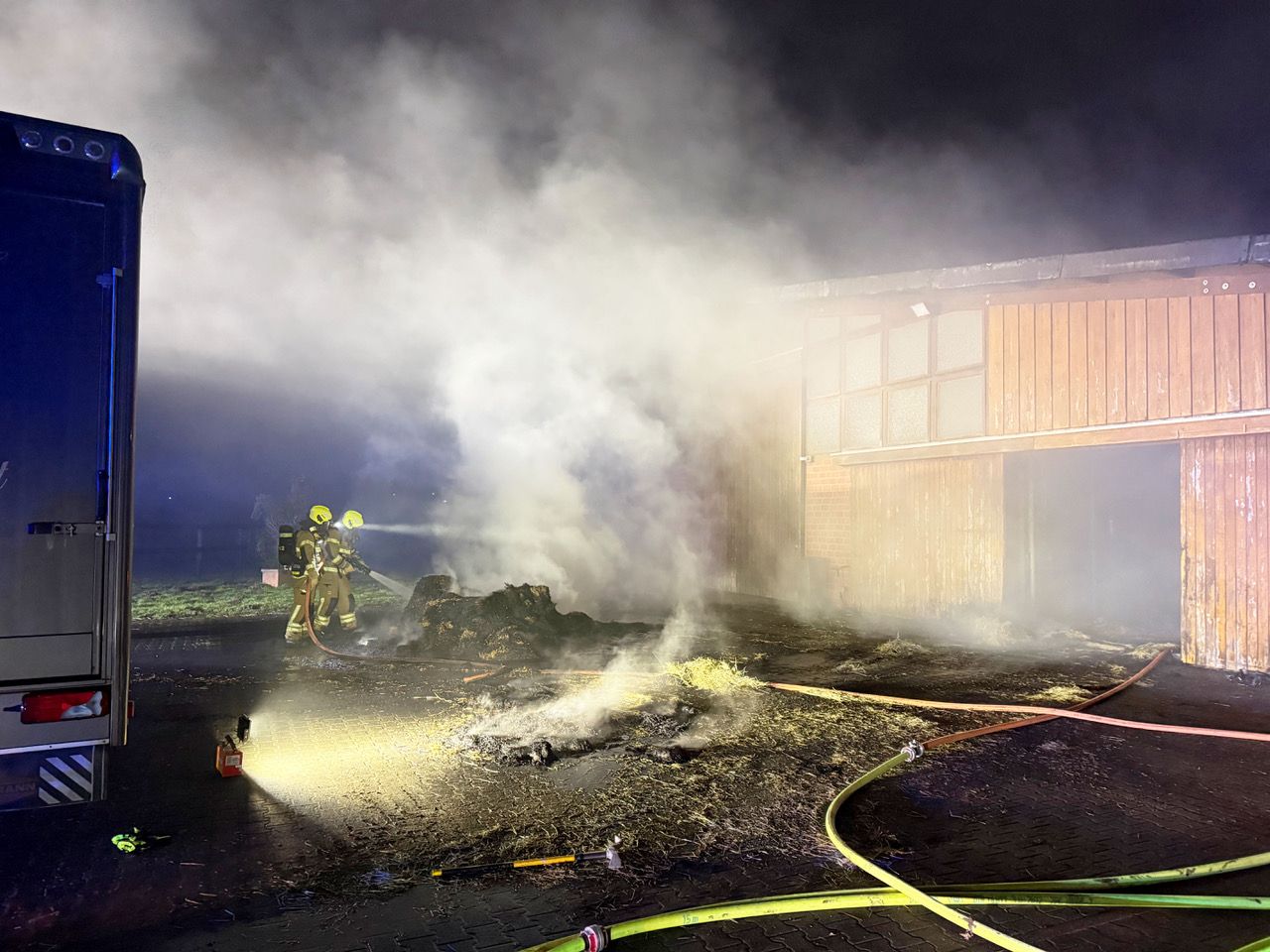 Außerdem wurden auch zwei Wechsellader mit den Abrollbehältern Pumpe/Schlauch und Atemschutz Richtung Wewer in Marsch gesetzt. Später kümmerte sich der Gerätewagen Logistik um den Abtransport der kontaminierten Bekleidung und des Schlauchmaterials. Insgesamt waren sechs Löschfahrzeuge und zwei Drehleitern auf dem Bauernhof im Einsatz.Vor dem Eintreffen der Feuerwehr gelang es den Bewohnern des Hofes, drei Pferde aus dem verrauchten Gebäude in Sicherheit zu bringen. Außerdem gelang es dem Personal, mit einem Radlader einen Teil des brennenden Strohs aus der Halle ins Freie zu fahren, wo es von Feuerwehrleuten auseinandergezogen und abgelöscht wurde.