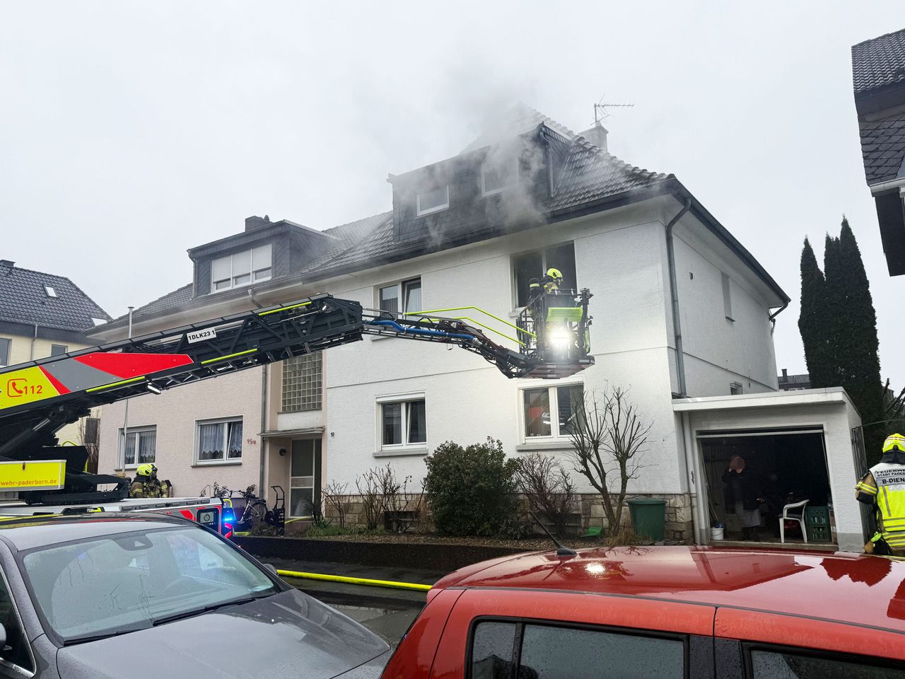 Zur gleichen Zeit quoll aus dem ausgebauten Dachgeschoss bereits dichter, gelblicher Rauch, so dass die Feuerwehr zunächst von einem Dachgeschoss- oder Dachstuhlbrand ausging. Bei der Durchsuchung der einzelnen Wohnungen entdeckte ein Angriffstrupp den Brandherd in einem Eckzimmer im ersten Obergeschoss. Beim Löschen der Flammen stellten die Feuerwehrleute fest, dass sich das Feuer offenbar durch die Zimmerdecke bereits in die Wohnung im Dachgeschoss ausgebreitet hatte. Dabei wurde die Zwischendecke und die Dachhaut geöffnet.