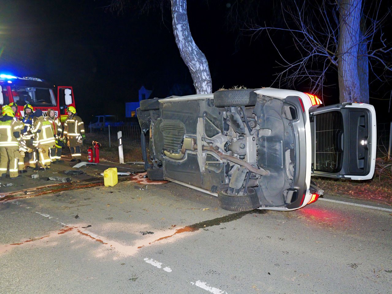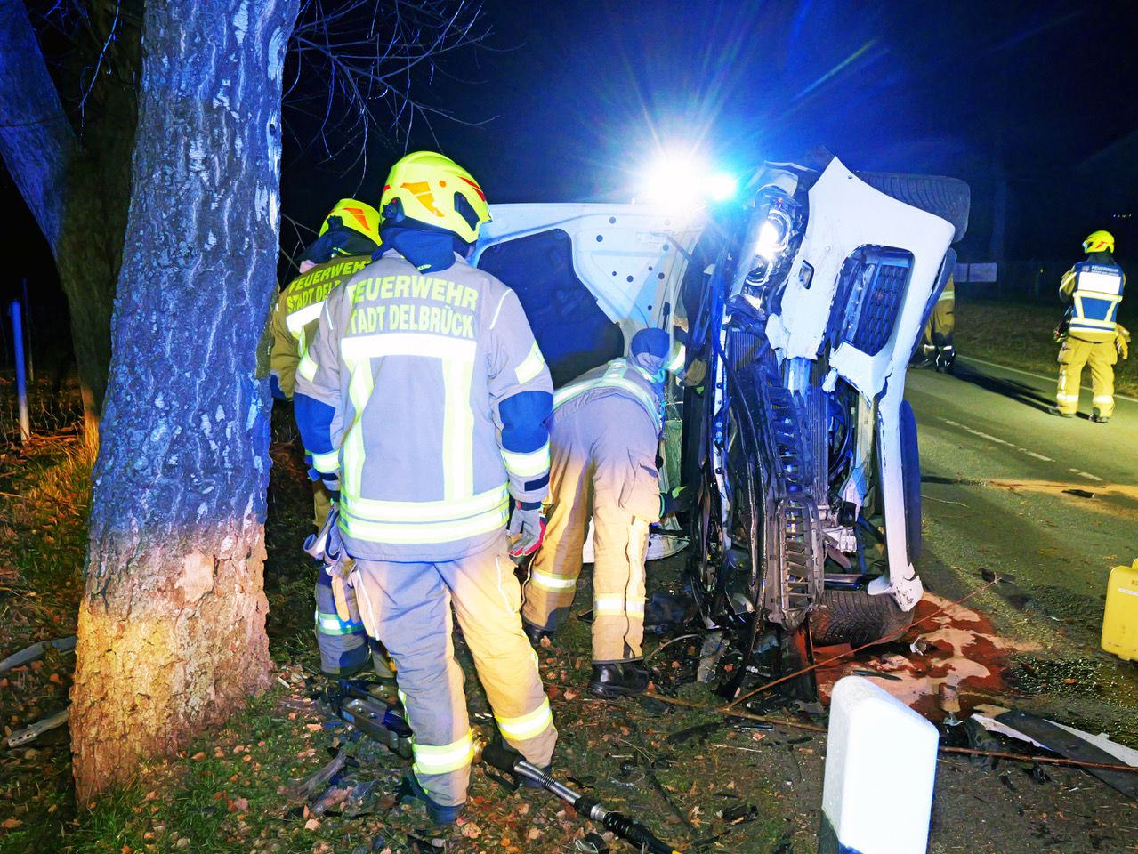 Spektakulärer Einsatz für die Feuerwehr Delbrück am frühen Morgen des zweiten Weihnachtsfeiertages auf der Osterloher Straße (Kreisstraße 6). Gegen 4.20 Uhr kam ein mit zwei Personen besetzter 5er-BMW-Kombi auf der Fahrt in Richtung Lippling in einer Linkskurve in Höhe des Noltenhofs nach rechts von der Fahrbahn an, touchierte mehrere Bäume und wurde zurück auf die Fahrbahn geschleudert.
