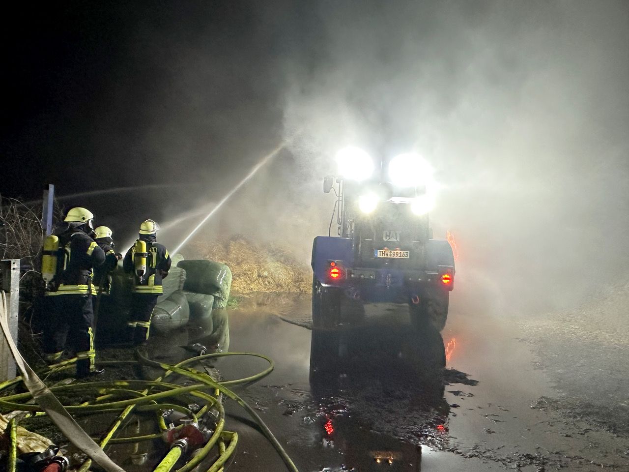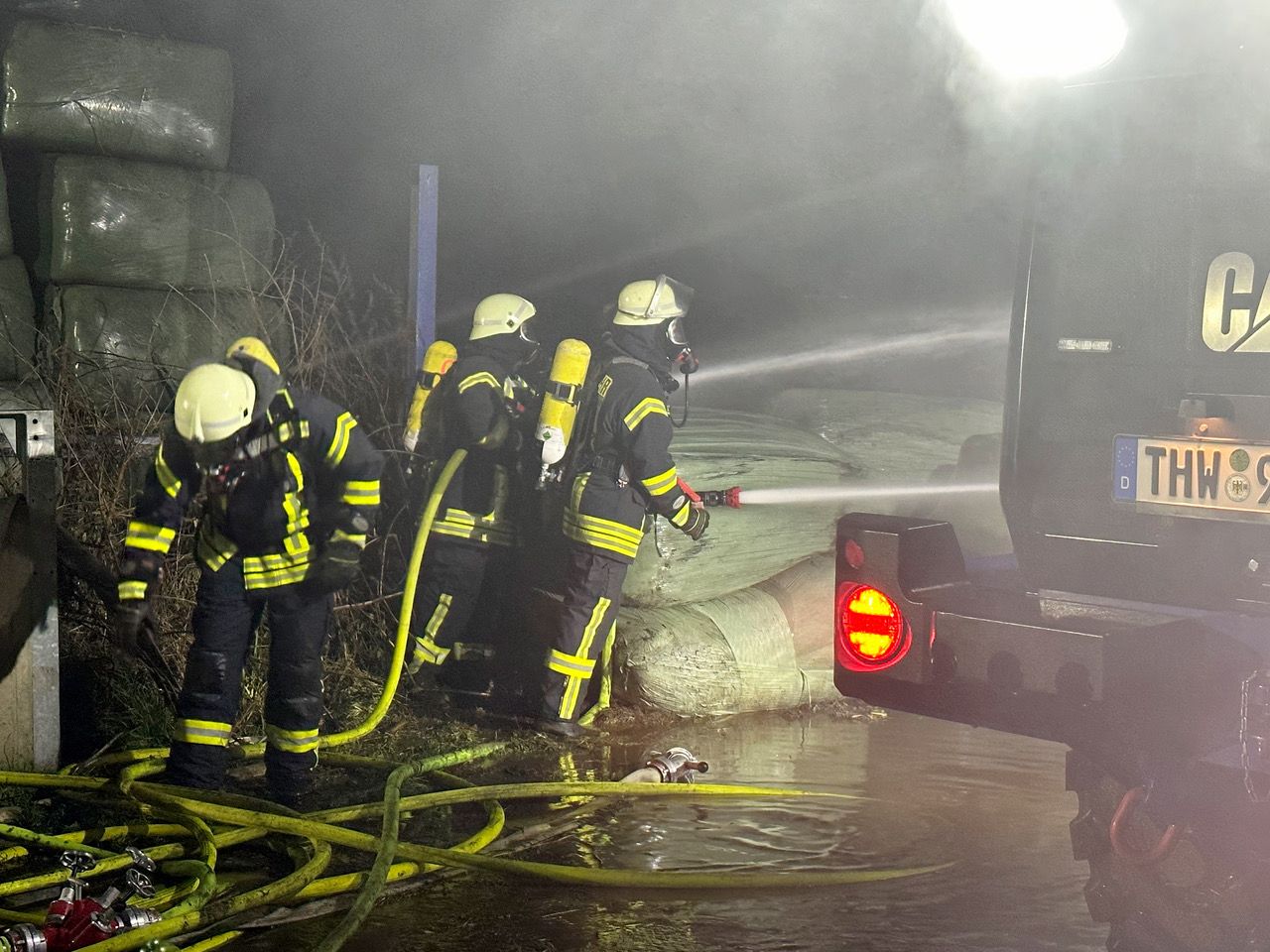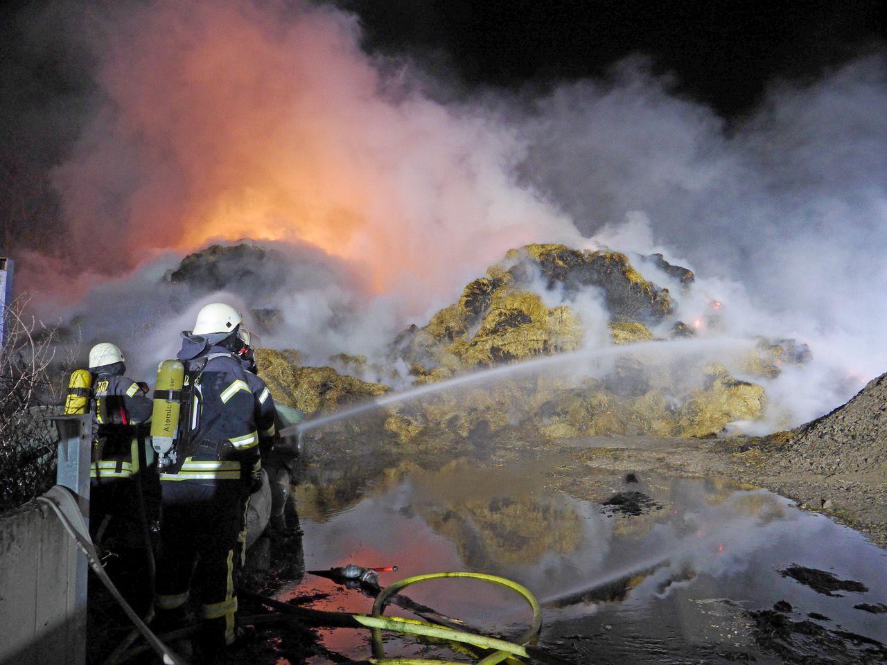 Großbrand auf einem Bauernhof im Salzkottener Stadtteil Verlar. In der Nacht zu Freitag stehen auf einem Bullenmastbetrieb an der Straße Lange Wenne südlich der Lippstädter Straße knapp 2.000 Strohballen in Flammen. Diese quaderförmigen Ballen haben pro Stück ein Gewicht von rund 250 Kilo.