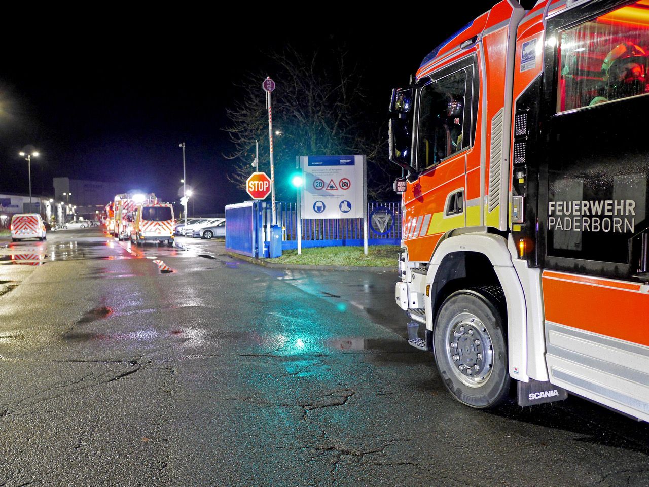 Mit einem Großaufgebot an Fahrzeugen und Einsatzkräften rückte die Feuerwehr Paderborn am späten Mittwochabend zur Benteler AG in Schloß Neuhaus aus.