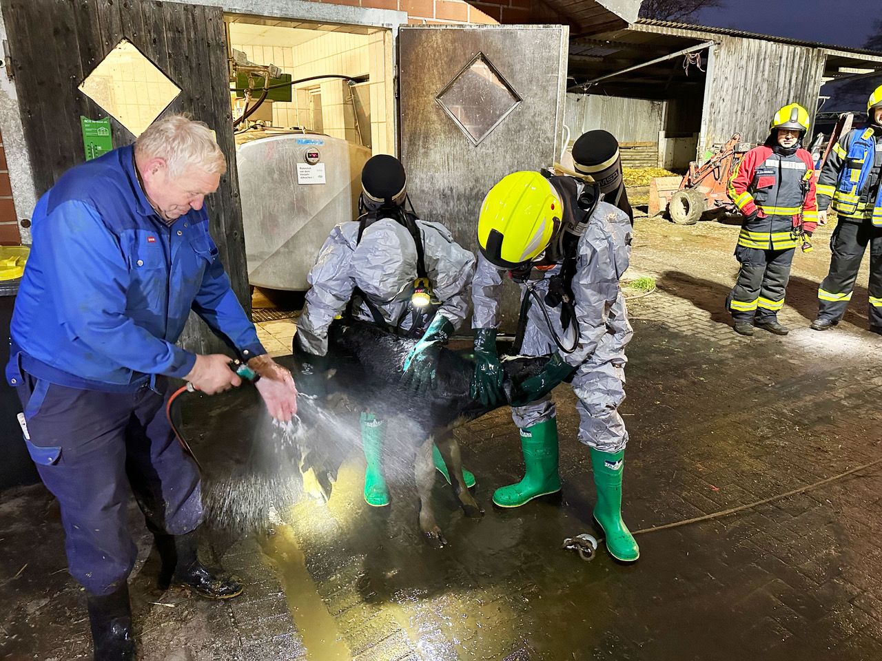 Während Hunderte von Kindern auf dem Nikolausmarkt am Samstagnachmittag in der Sennegemeinde im Schlossgarten mit Schokonikoläusen vom Nikolaus beschenkt wurden, lösten die Meldeempfänger der ehrenamtlichen Feuerwehrleute aus. Auf einem Bauernhof galt es, ein erst wenige Stunden altes Bullenkalb aus der Güllegrube zu retten.