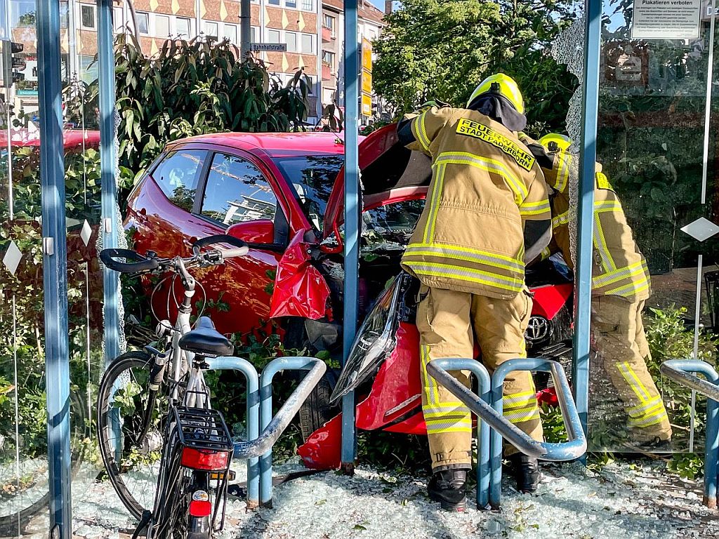 Bei einem Verkehrsunfall am Westerntor verlor am frühen Samstagabend eine 82 Jahre alte Autofahrerin die Kontrolle über ihren Kleinwagen, der Sekunden später in einen verglasten Fahrradunterstand vor der Herz-Jesu-Kirche prallte.