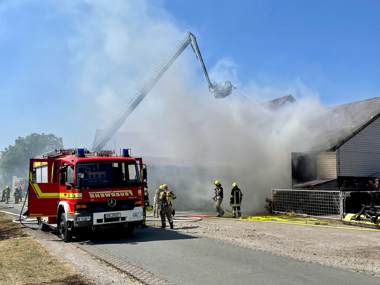 Am bisher heißesten Tag des Jahres hat eine Scheune eines landwirtschaftlichen Anwesens am Richtweg in Bad Lippspringe Feuer gefangen. Bei 39 Grad im Schatten, der in der Feldflur jedoch Mangelware war, gerieten die Löscharbeiten am Dienstagnachmittag zur Quälerei für die 54 Einsatzkräfte aus Bad Lippspringe und dem benachbarten Schlangen.
