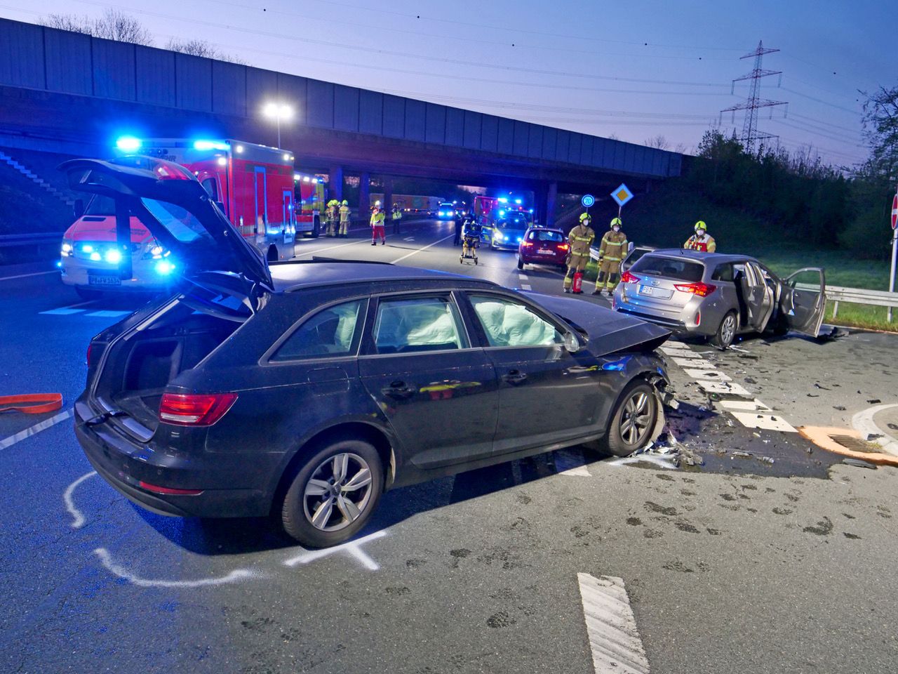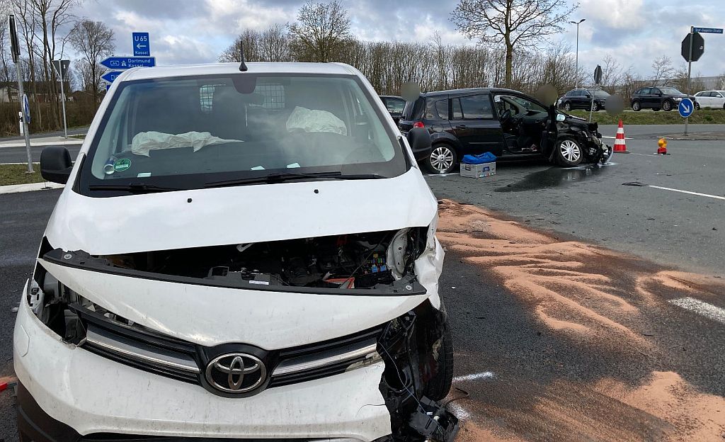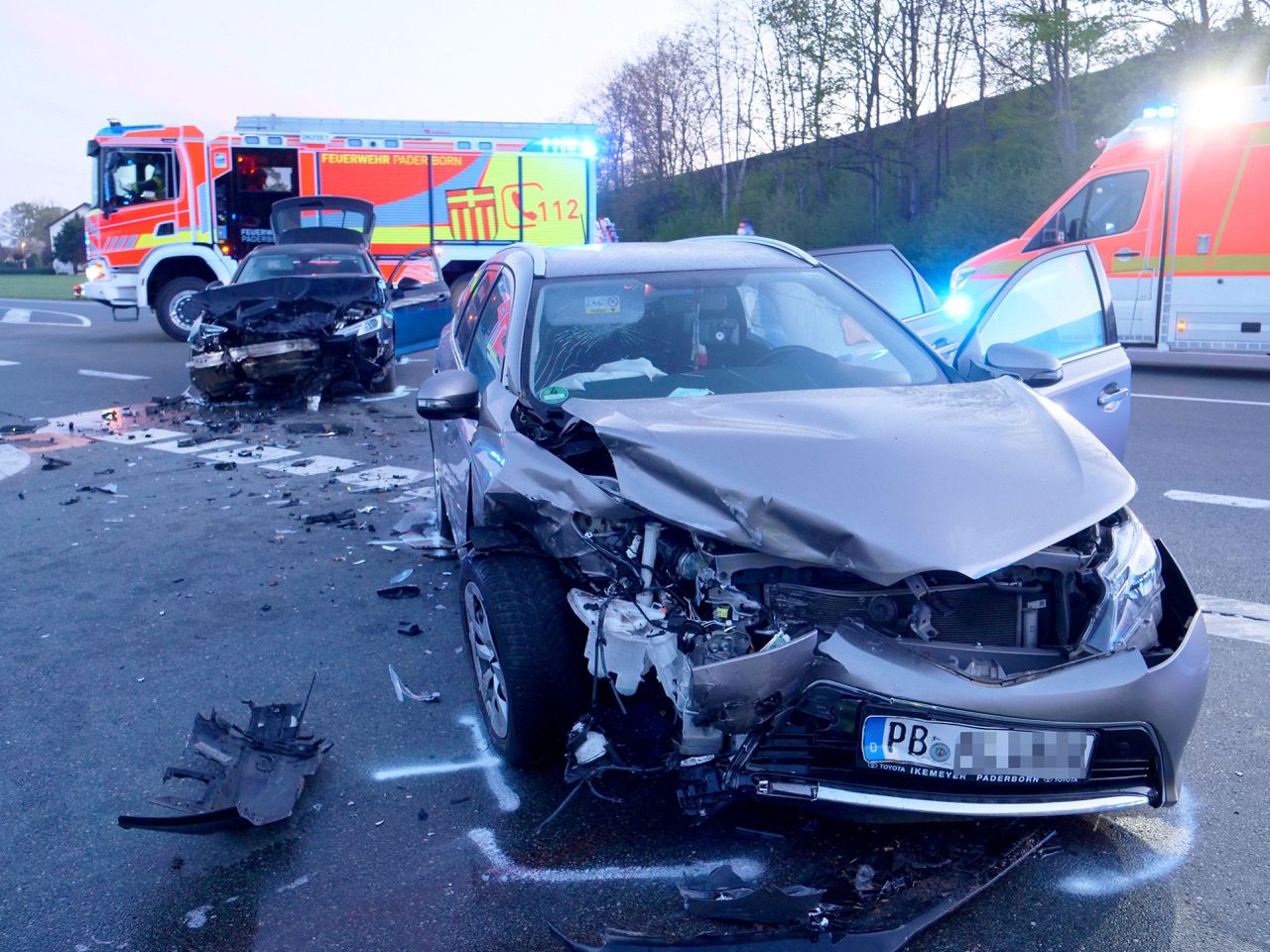 Beim Zusammenstoß von zwei Personenwagen auf der Bundesstraße 64 (Münsterstraße) in Höhe der Anschlussstelle Paderborn-Schloß Neuhaus der Autobahn A 33 wurden am frühen Montagmorgen insgesamt fünf Personen verletzt, darunter zwei Kinder. Eine Frau wurde bei der Kollision leicht bis mittelschwer verletzt.