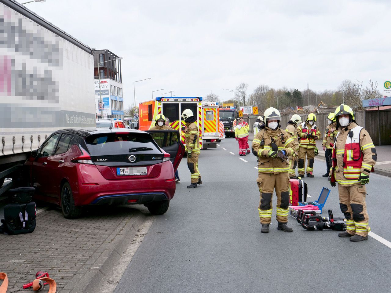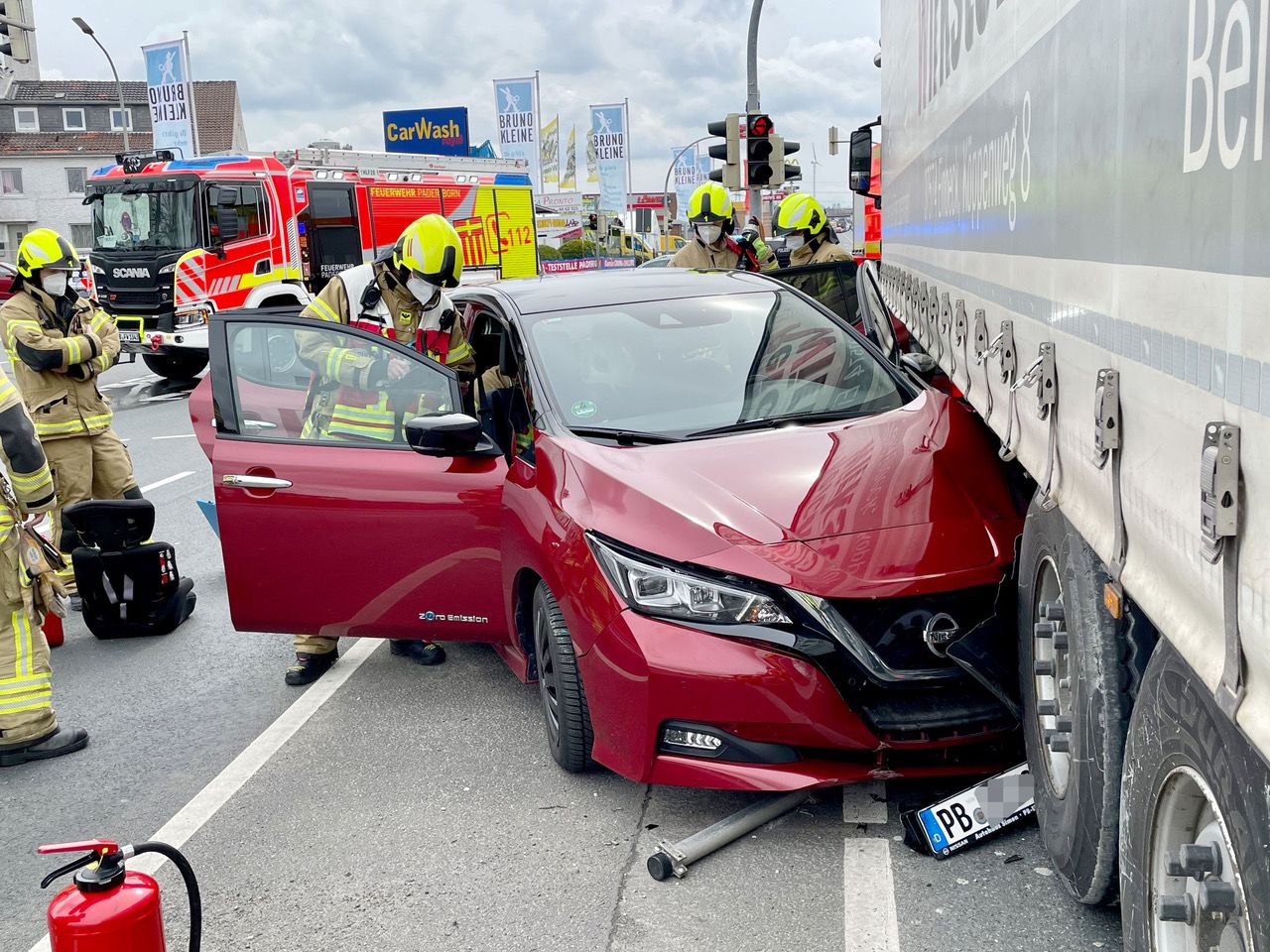 Zwei Menschen sind am Freitagmittag bei einem Zusammenstoß eines Autos mit einem Sattelzug im Bereich der Kreuzung Frankfurter Weg/Wollmarktstraße/Barkhauser Straße verletzt worden.