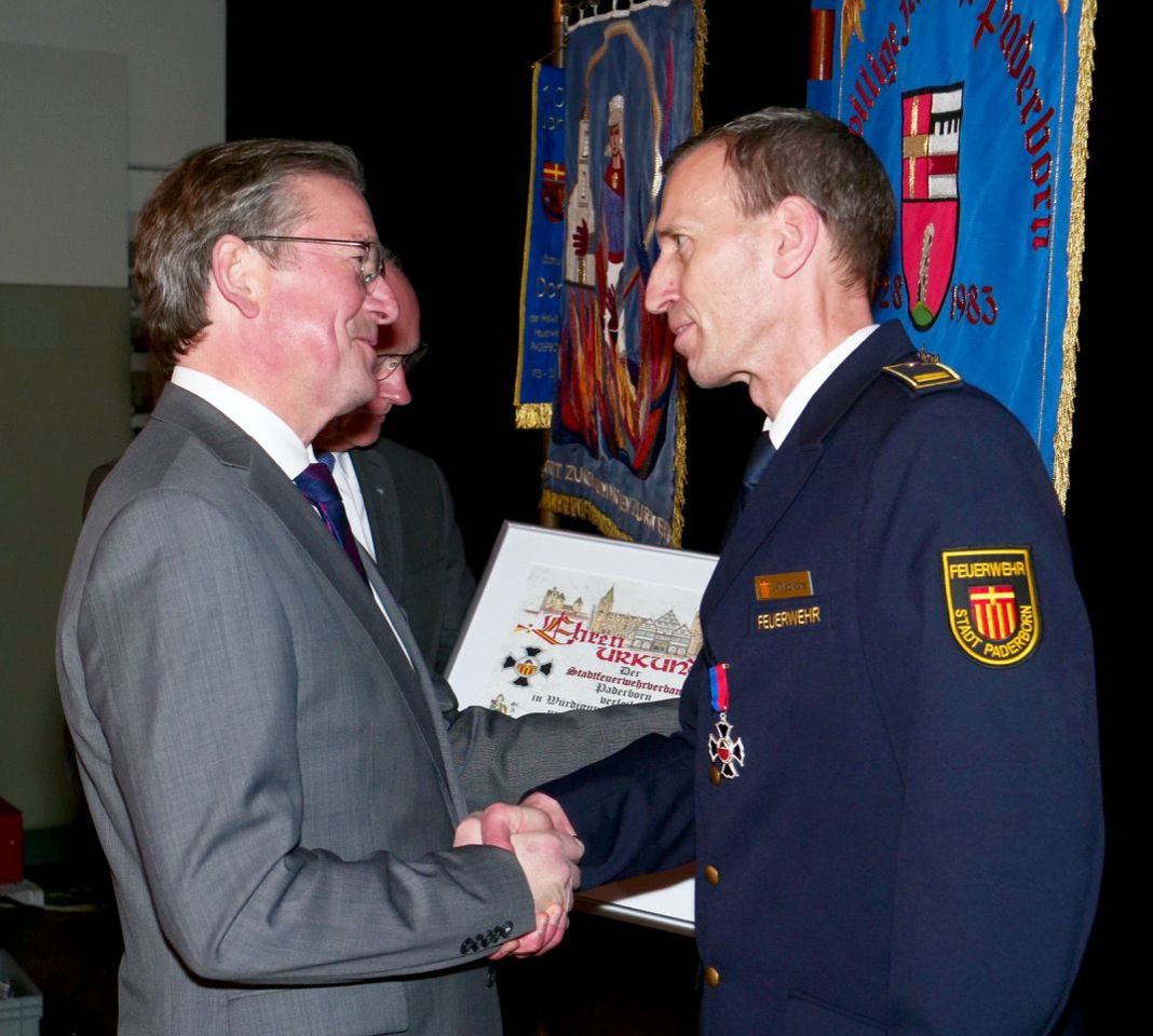 Die Jahreshauptversammlung der Freiwilligen Feuerwehr Paderborn stand ganz im Zeichen ihres scheidenden Leiters Ralf Schmitz, der seit 23 Jahren an der Spitze der Paderborner Wehr steht. Anfang Mai wird er die Leitung der hauptamtlichen Kräfte an seinen Nachfolger Ludger Schmidt übergeben.