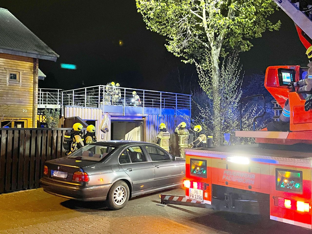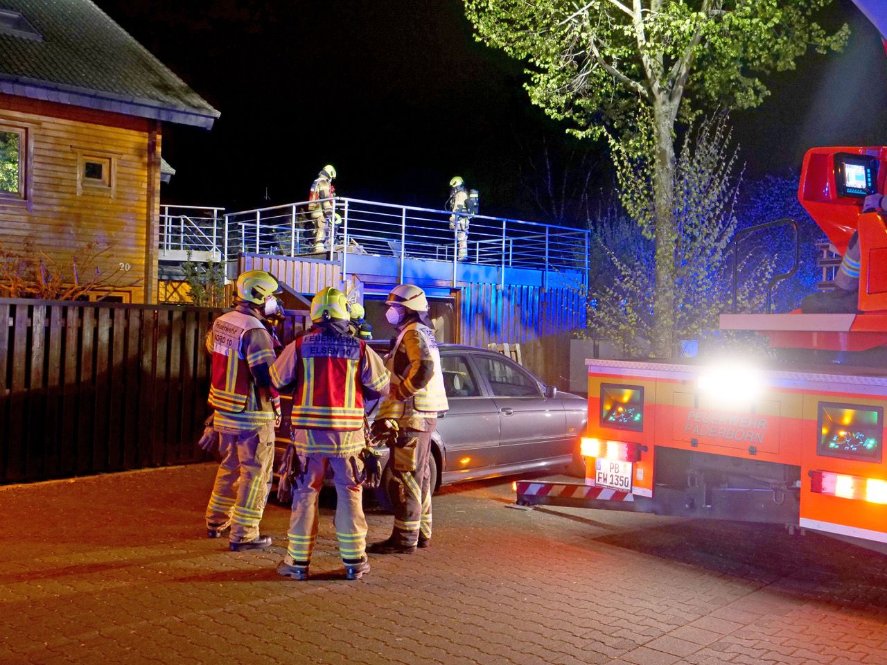 In der Nacht zu Freitag rückte die Feuerwehr Paderborn zum gemeldeten Brand eines Balkons auf dem Flachdach einer Garage an der Franz-Hitze-Straße im Riemekeviertel aus. Aus unbekannter Ursache waren die Balkondekoration und die Holzbohlen des Balkons in Brand geraten.