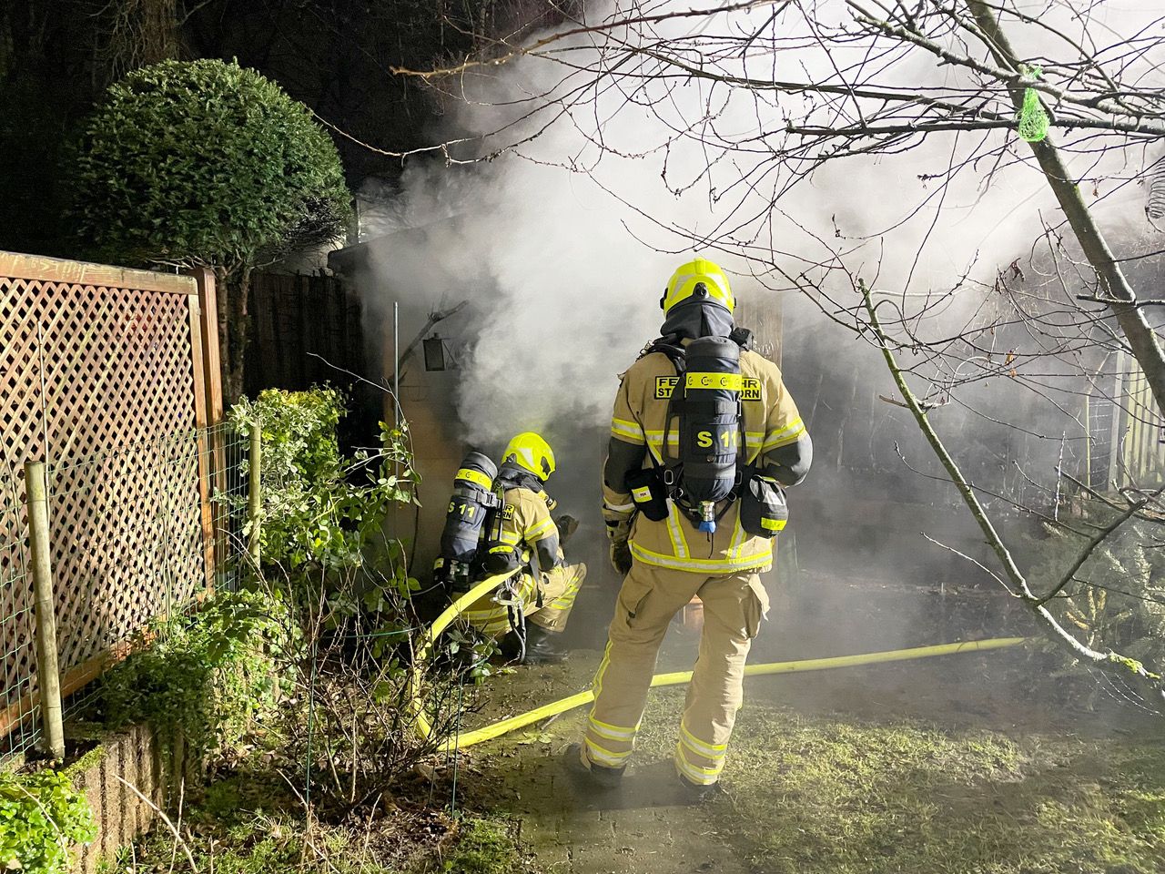 In den frühen Morgenstunden des Dienstags stand eine Gartenhütte im rückwärtigen Bereich eines Mehrfamilienhauses an der Theodor-Heuss-Straße im Riemekeviertel in Flammen.