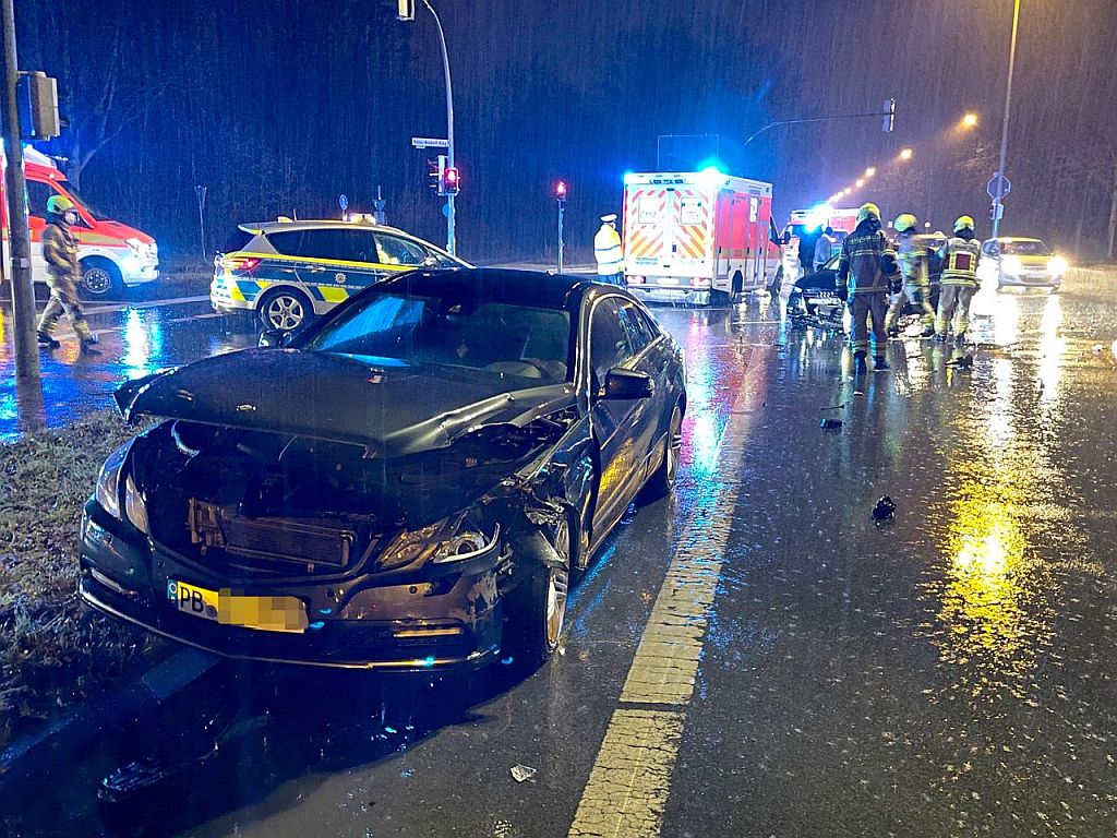Bei einem schweren Verkehrsunfall an Heiligabend stießen zwei Personenwagen zusammen. Dabei wurden mindestens vier der insgesamt sechs Insassen verletzt. Der Unfall ereignete sich gegen 16.35 Uhr im Kreuzungsbereich des Heinz-Nixdorf-Rings (L 813) mit den Straßen Straße Wilhelmshöhe und Münsterstraße.