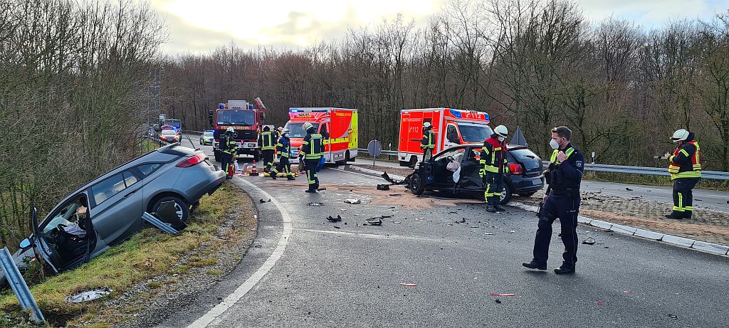 Beim Zusammenstoß von zwei Personenwagen auf der Bundesstraße 64 in Höhe Benhausen wurden am Samstagmittag zwei Autofahrer verletzt. Die Kollision ereignete sich gegen 13.30 Uhr im Bereich der Einmündung der der Straße Im Knick (L 937) in die Bundesstraße 64.