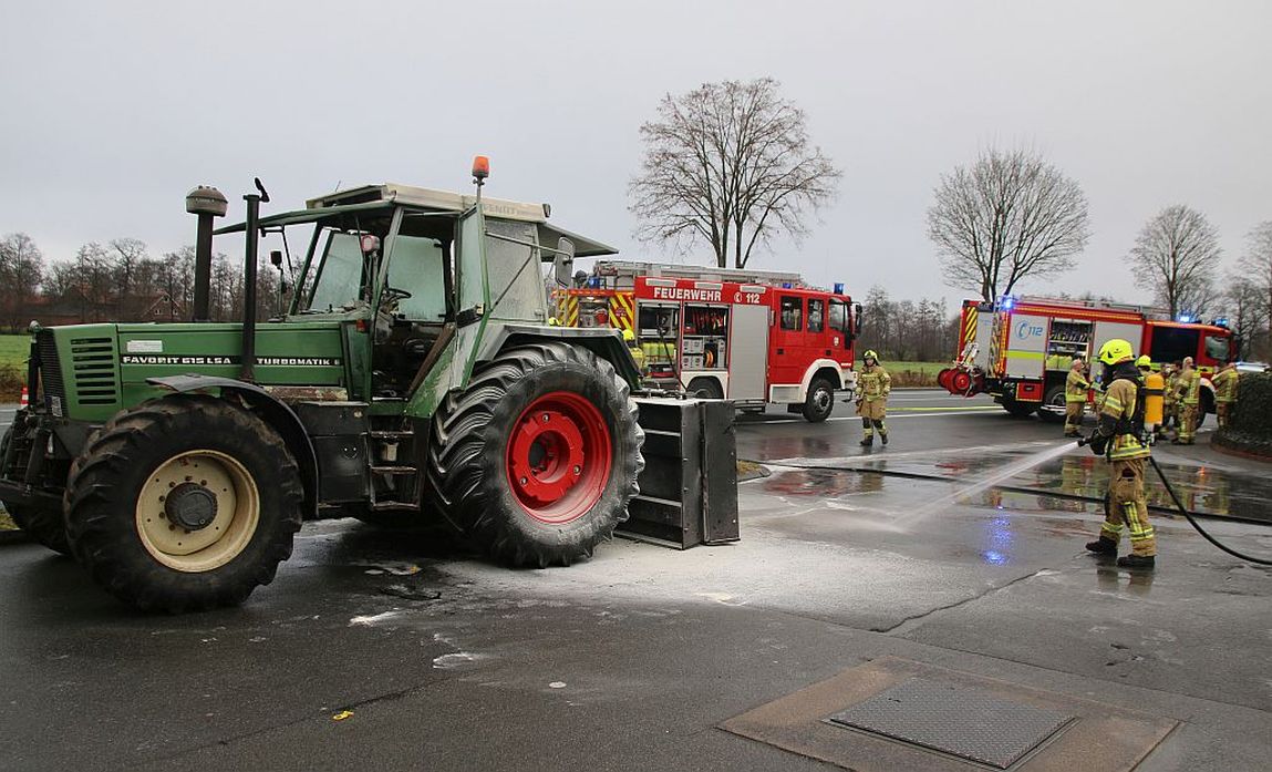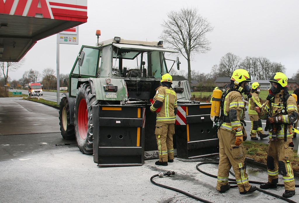 Erste Löschversuche mit Feuerlöscher verhindern Schlimmeres in Westenholz. Traktor gerät auf Tankstellengelände in Brand.