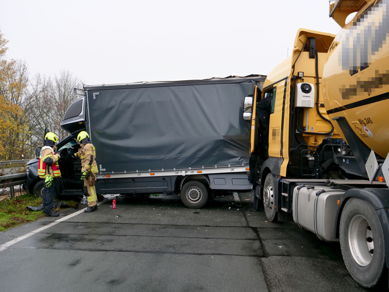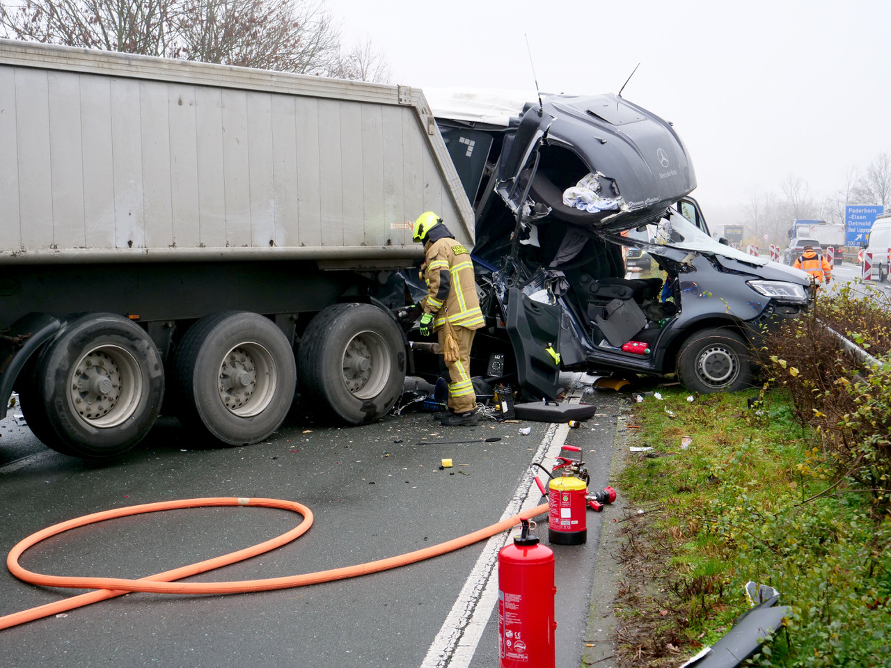 Der Unfall ereignete sich gegen 11.55 Uhr etwa 300 Meter hinter der Anschlussstelle Elsen. Die Unfallstelle liegt direkt auf der Brücke über die Straße Im Schlinge. Am Stauende hielte ein 53-Jähriger aus Bielefeld mit seinem Sattelzug und ein 29 Jahre alter Fahrer eines polnischen Kleinlasters am Stauende an. Danach fuhr ein Silozug aus dem niedersächsischen Landkreis Gifhorn, gesteuert von einem 55 Jahre alten Mann, auf das polnische Gespann auf und schob es auf den haltenden Sattelzug.