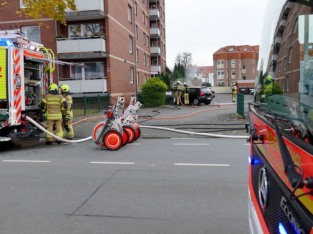 Rund 20 Einsatzkräfte der Paderborner Feuerwehr rückten Samstagmittag zu einem Fahrzeugbrand auf einem Parkplatz eines Mehrfamilienhauses an der Rathenaustraße aus.