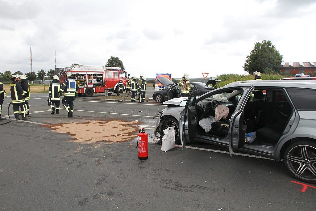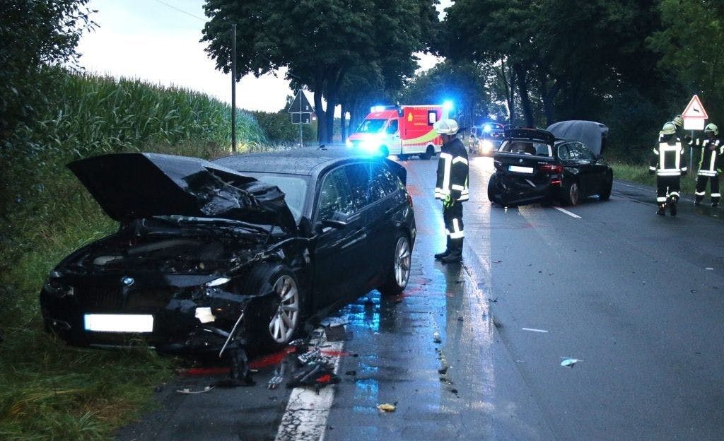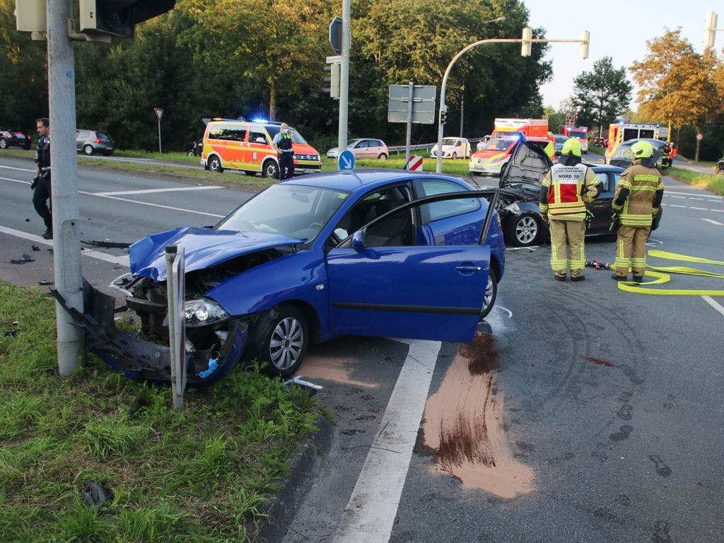 Zwei Autos stoßen auf Kreuzung in Paderborn frontal zusammen. Schwangere und zwei Kinder verletzt.