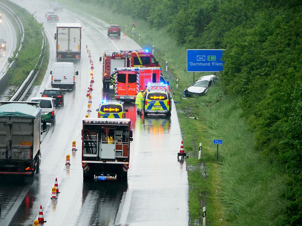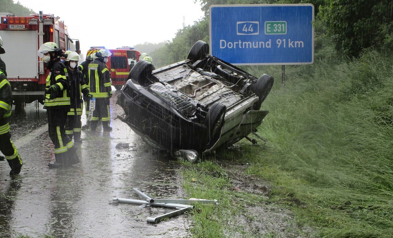 Starke Niederschläge sind die Ursache für einen schweren Verkehrunfalls, der sich in den Mittagsstunden des Donnerstages auf der Autobahn 44 in Höhe des Stadtteils Haaren ereignete. Gegen 13.25 Uhr geriet der Fahrer eines Personenwagens auf der Richtungsfahrbahn Dortmund in einen heftigen Gewitterschauer.