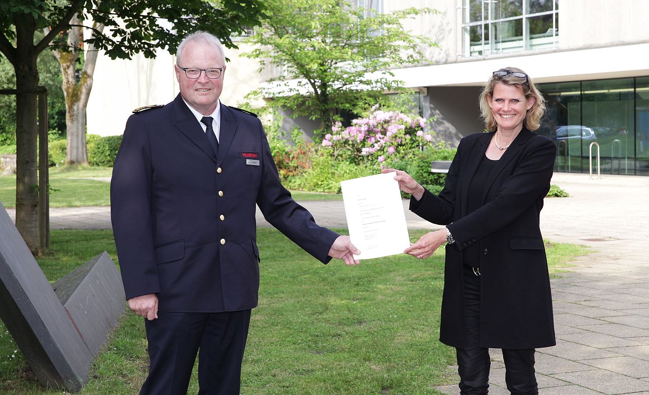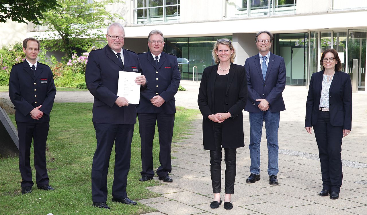 Elmar Keuter aus dem Kreis Paderborn ist am Dienstag, 8. Juni, bei der Bezirksregierung Detmold für weitere sechs Jahre als Vize-Bezirksbrandmeister bestellt worden. Keuter hatte den Posten erstmals zum 1. Juli 2015 übernommen. Regierungspräsidentin Judith Pirscher nahm die Ernennung vor und gratulierte Keuter zur zweiten Amtszeit.