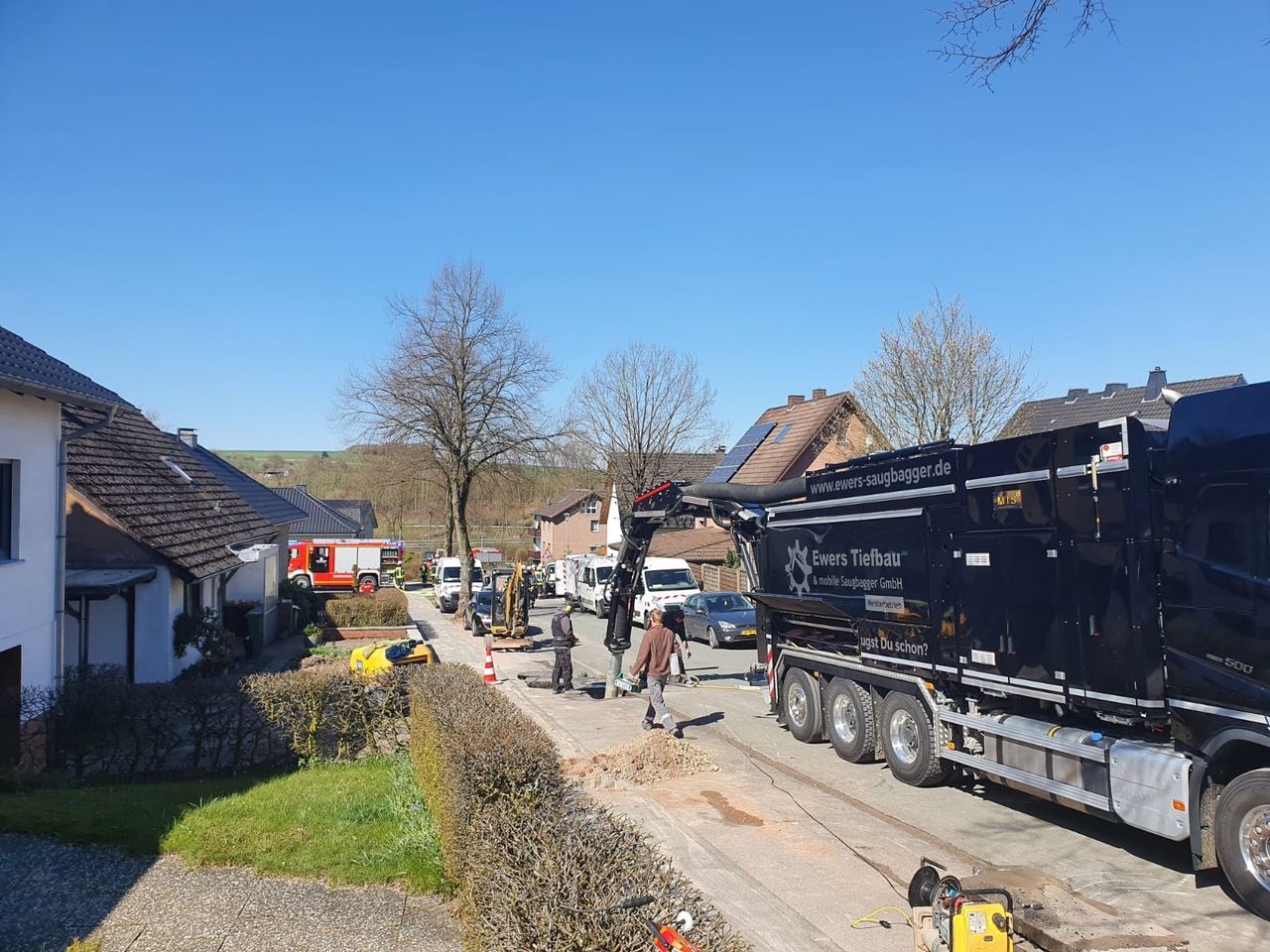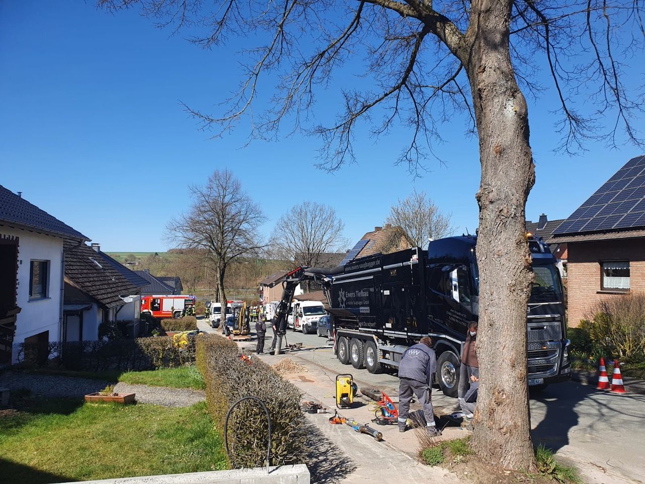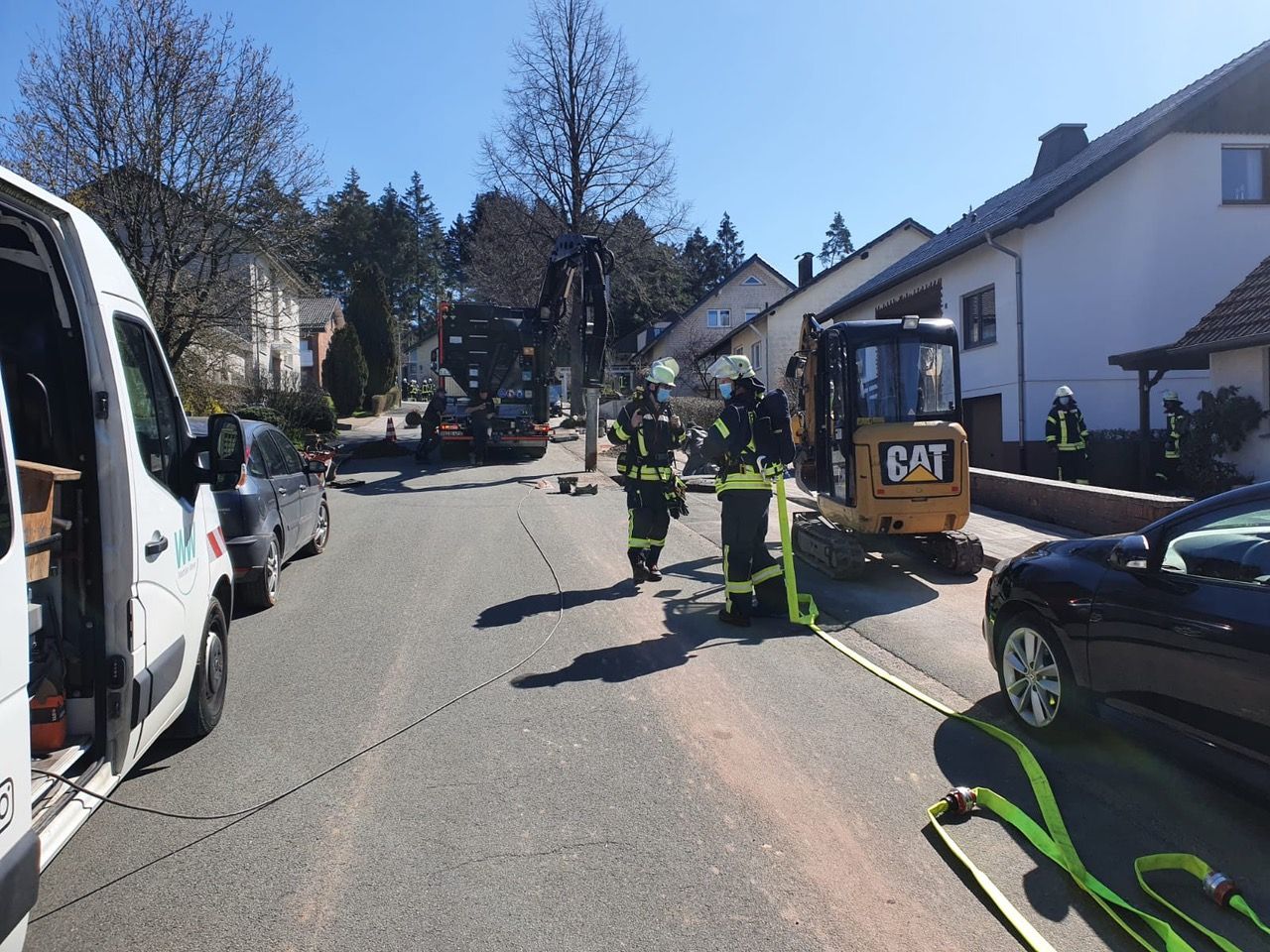 Gasaustritt bei Verlegearbeiten von Glasfaserkabel in Altenbeken. Die Häuser in der Wohnstraße Tannenweg wurden geräumt. Anschließend wurde die beschädigte Gasleitung abgeschiebert.