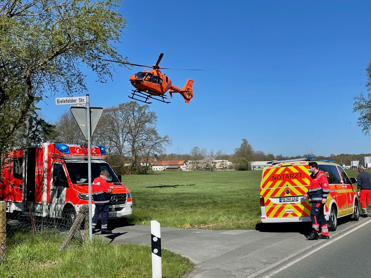 Eine nicht alltägliche Fahrerflucht nach einem Verkehrsunfall erlebten am Dienstagvormittag mehrere Polizistinnen und Polizisten im Paderborner Stadtteil Sennelager hautnah. Die Flucht endete nach einem Verkehrsunfall im Rettungshubschrauber, denn der flüchtige und alkoholisierte Autofahrer aus Bielefeld hatte schwere Blessuren davongetragen.