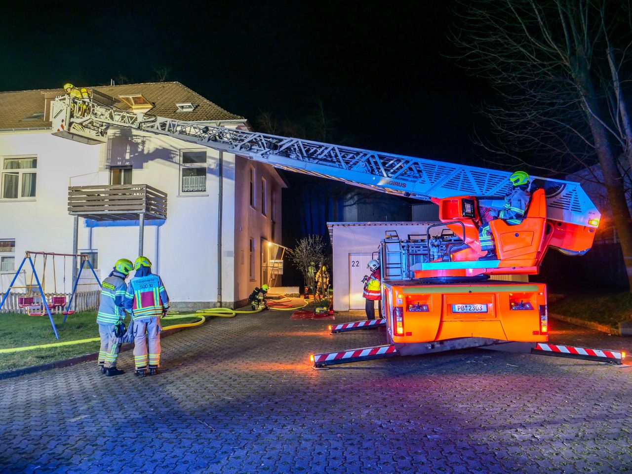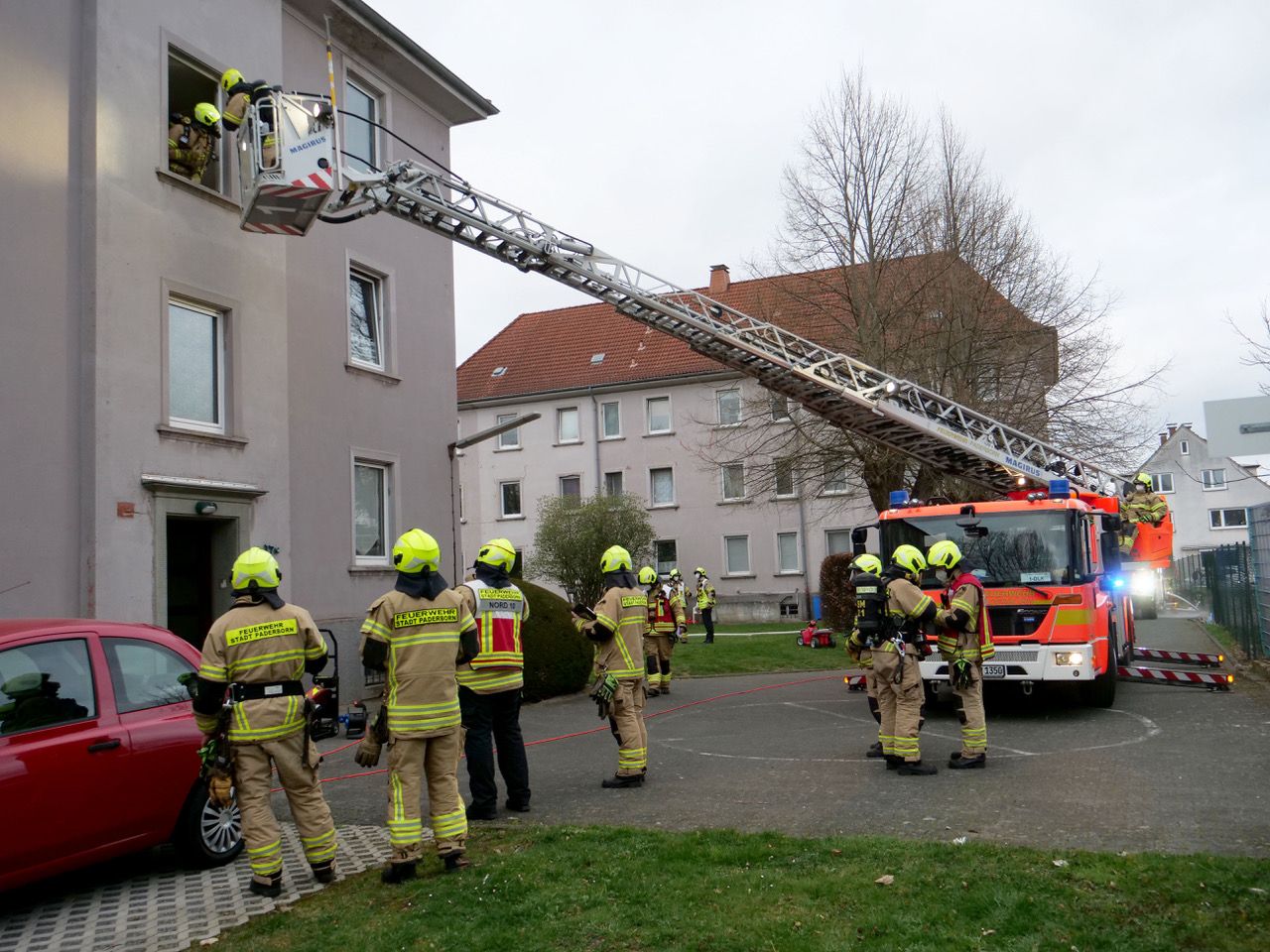 Drei Personen retteten Einsatzkräfte der Feuerwehr Paderborn bei einem Brand in einem Mehrfamilienhaus an der Dessauer Straße am frühen Mittwochmorgen über die Drehleiter aus dem Obergeschoss.