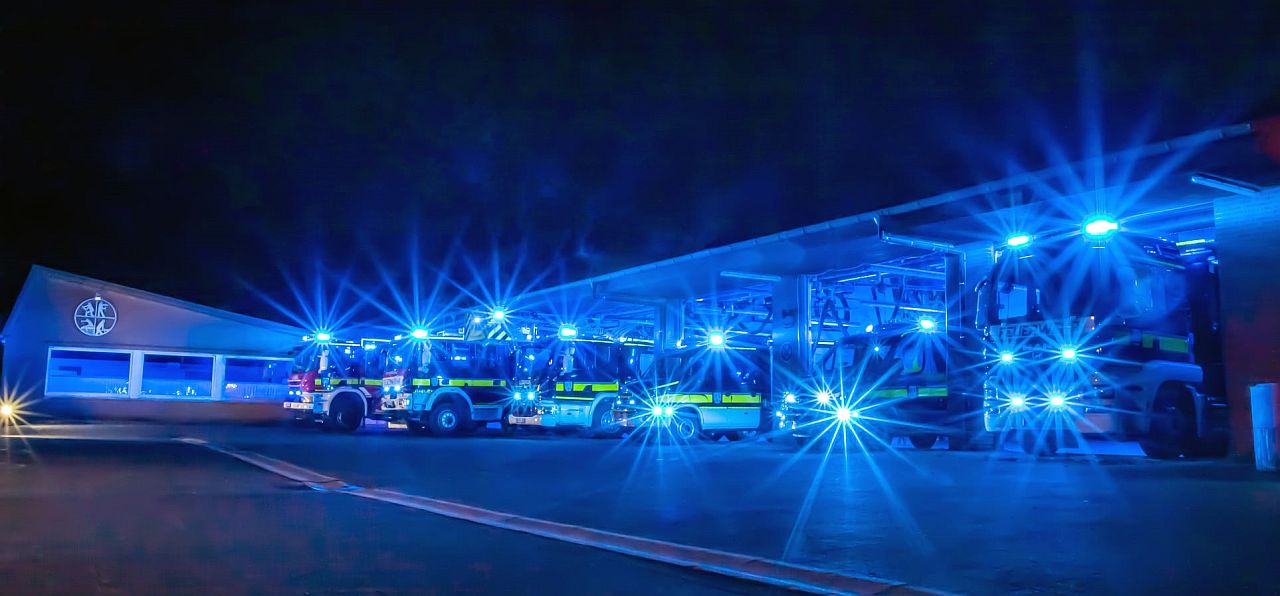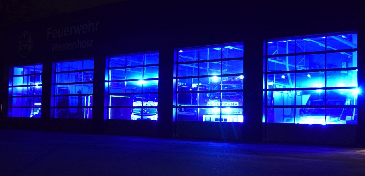 Aktion der Feuerwehren taucht Wachen in blaues Licht. Unter dem "Hashtag" bluelightfirestation machen die Feuerwehren im Land derzeit auf die besonderen Herausforderungen in Corona-Zeiten aufmerksam.