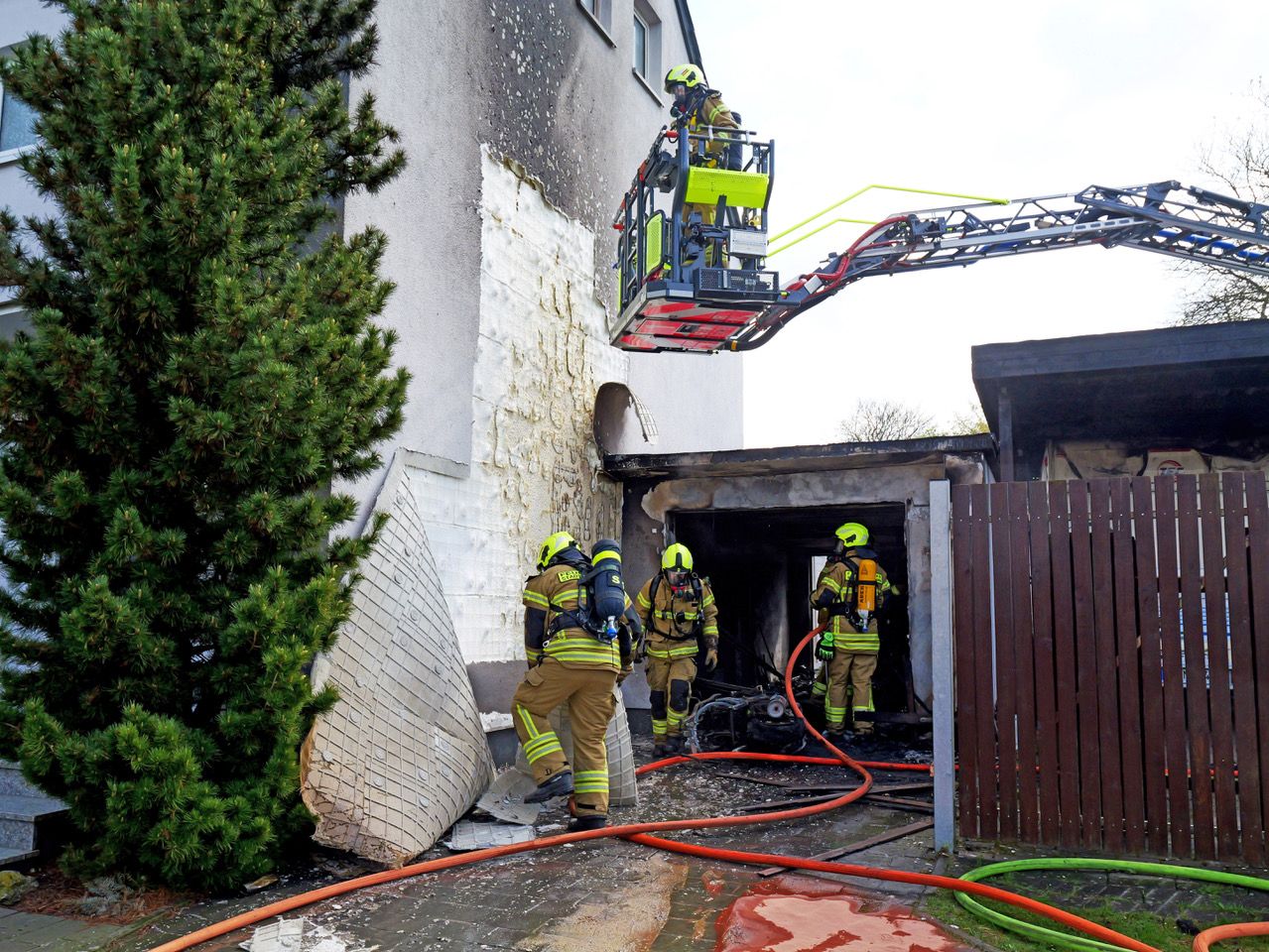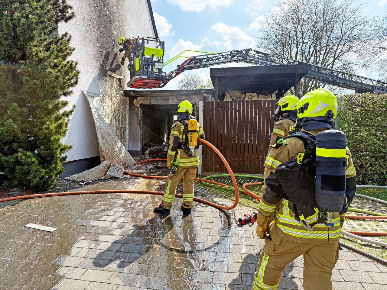 Spektakulärer Feuerwehreinsatz am südlichen Querweg. Gegenüber der Sporthalle Südstadt gingen am frühen Nachmittag ein Motorroller in einer Garage und ein Wohnmobil in einem angrenzenden Carport in Flammen auf. Ein vor dem Haus geparkter BMW und die die Giebelseite des Reihenhauses wurden schwer in Mitleidenschaft gezogen.