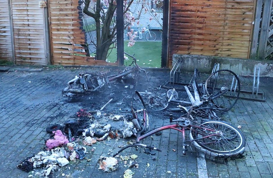 In einem Hinterhof brennen Roller und Mülltonnen. Eindeutige Hinweise auf vorsätzliche Brandstiftung in Westenholz.